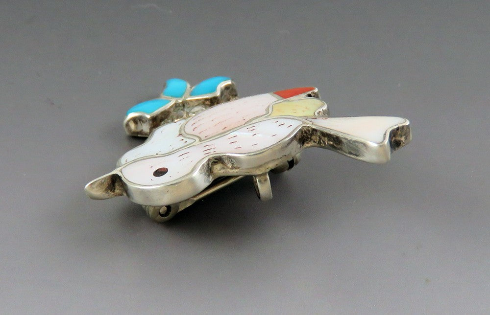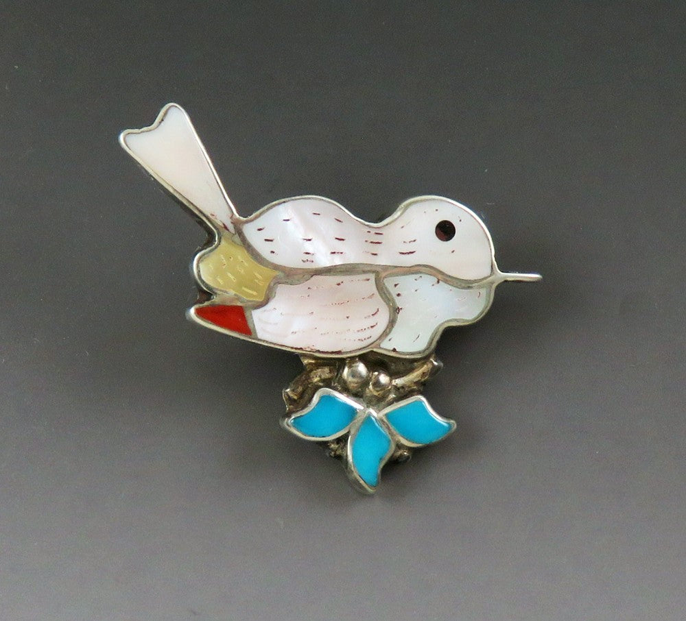 Presented is an excellent Native American Indian sterling silver gemstone inlay brooch or pendant, in the form of a bird. This is a nice vintage piece of Zuni art, featuring inlay of turquoise, mother of pearl, and red coral. The mother of pearl is in pink, white, and gold shades, to give the bird a very colorful look. The bird is holding a little twig with turquoise 'leaves,' perhaps this is a dove or turtledove. The brooch has a rollover style clasp as well as a loop/bail on the back, so it can be worn as a pendant or pin, however you like.