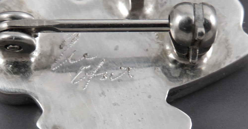 This piece is signed with a name I can't quite make out. We have tested this piece with nitric acid and guarantee it to be sterling silver.