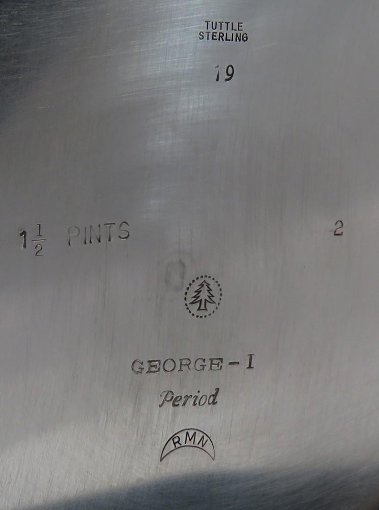The underside is marked Tuttle, sterling, George I Period, and has a date symbol RMN for production during Nixon's presidency (1969-1974).