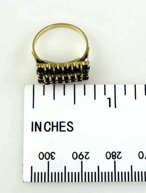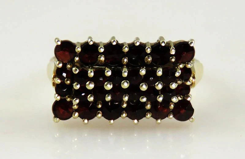 Presented is a very attractive, 14 karat yellow gold and natural garnet gemstone statement ring. The top is securely set with 28 faceted garnet gemstones. There are larger garnets on the top and bottom rows and the two center rows with the smaller garnets are raised above to add a nice dimension the ring. This piece can be resized by a professional jeweler if need be.