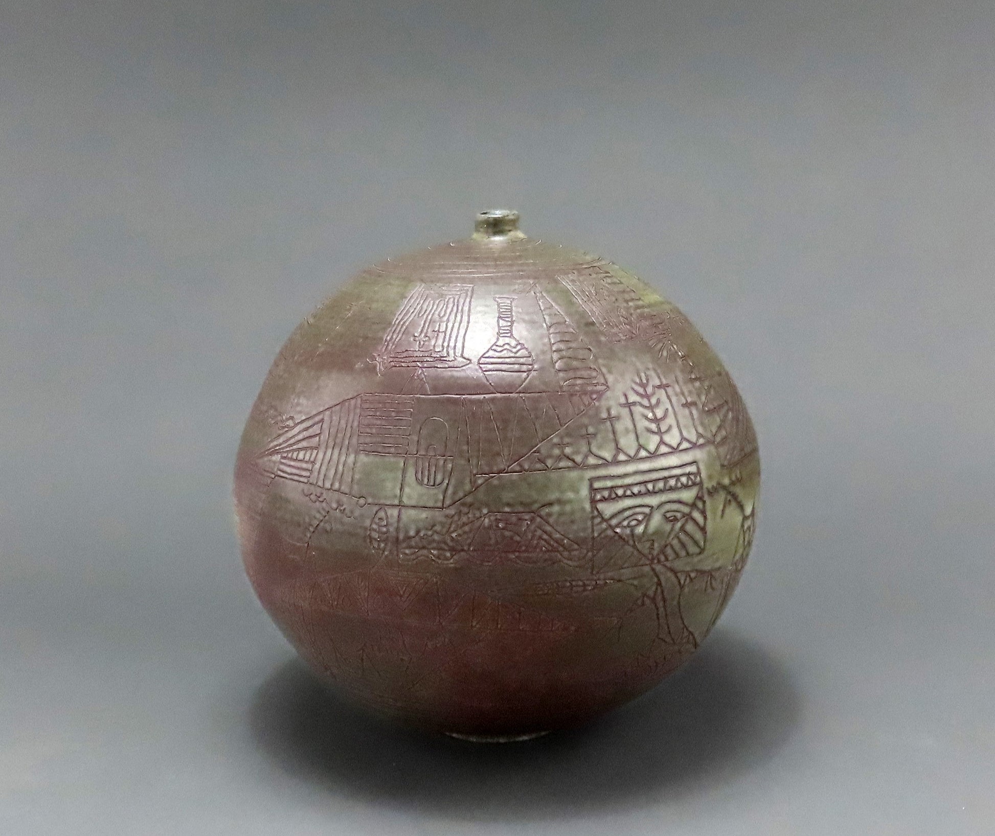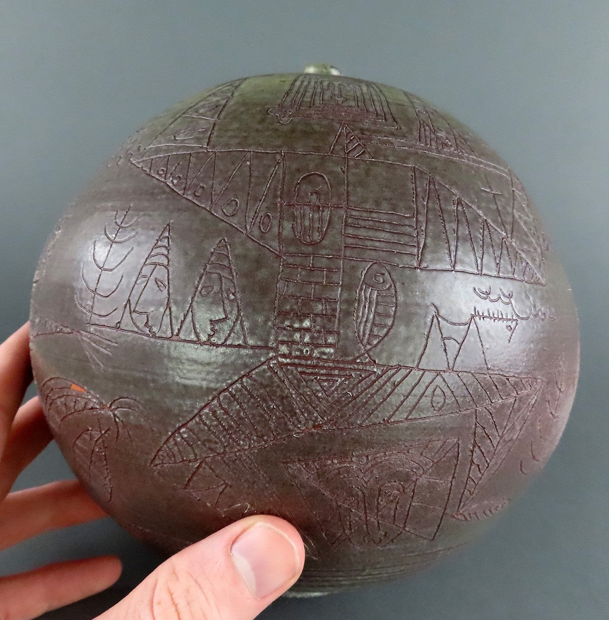 Presented is a stunning mid-century modern ceramic bud vase from David Holleman. This piece displays amazing modernist cubist figures, objects, and scenes. Among these figures there are many geometric designs. The vase is completely round with a small bud vase opening at the top. The piece is glazed in neutral tones which give an earthy and somewhat ancient feel. Some of the pattern details seem reminiscent of Picasso or other well-known cubist artists.
