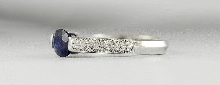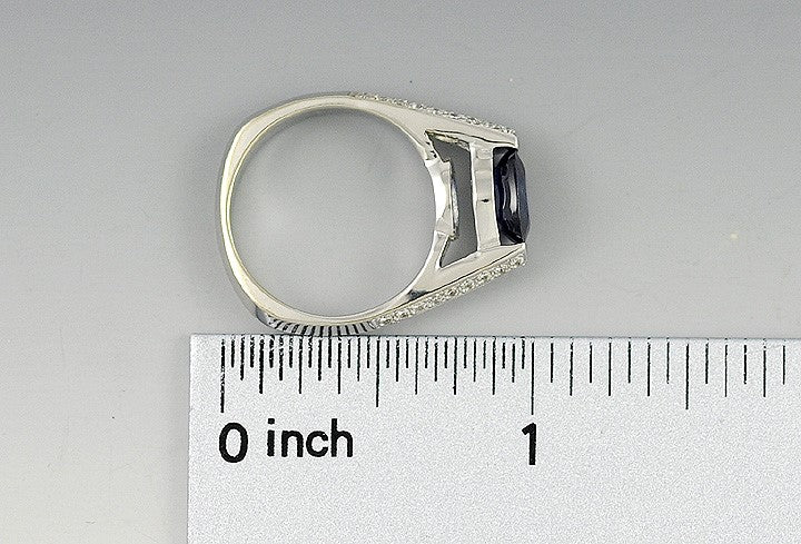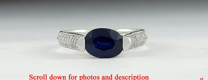 Presented is an eye-catching, 18 karat white gold, sapphire and diamond ring. This is a modern piece and is well constructed. The top of the ring is highly raised off of the finger and is securely set with an oval, faceted sapphire. The sapphire measures approximately 8.1 by 6.1 by 3.5 millimeters and is about 1.4 carats. The sides or shoulders of the ring are set with 36 full cut diamonds. The diamonds are full of life and there is at least 1/4 of a carat in total diamond weight in this ring. This ring is a size 6 1/2.
