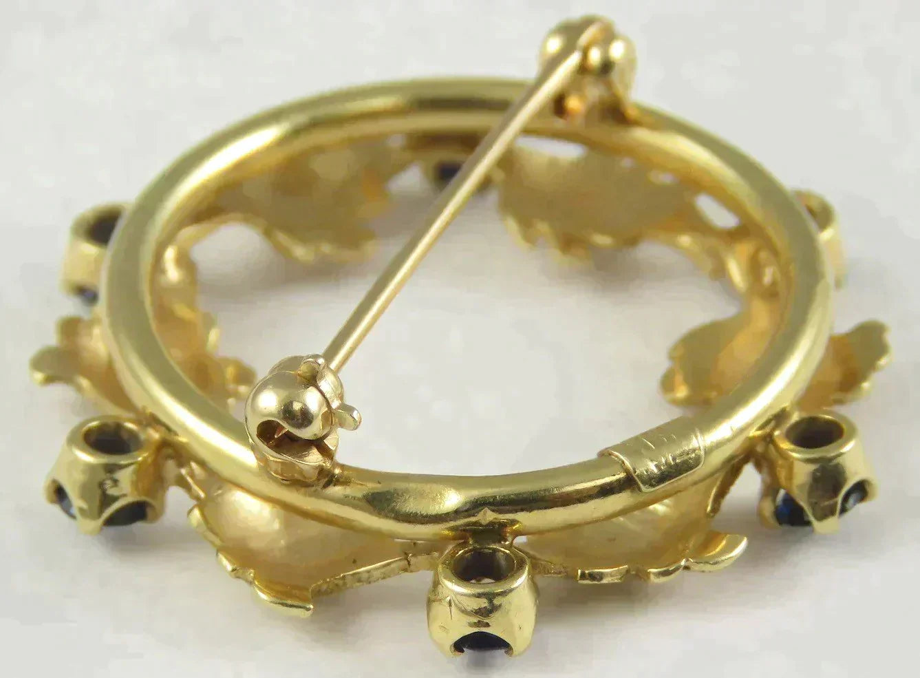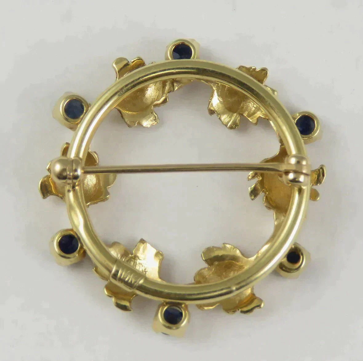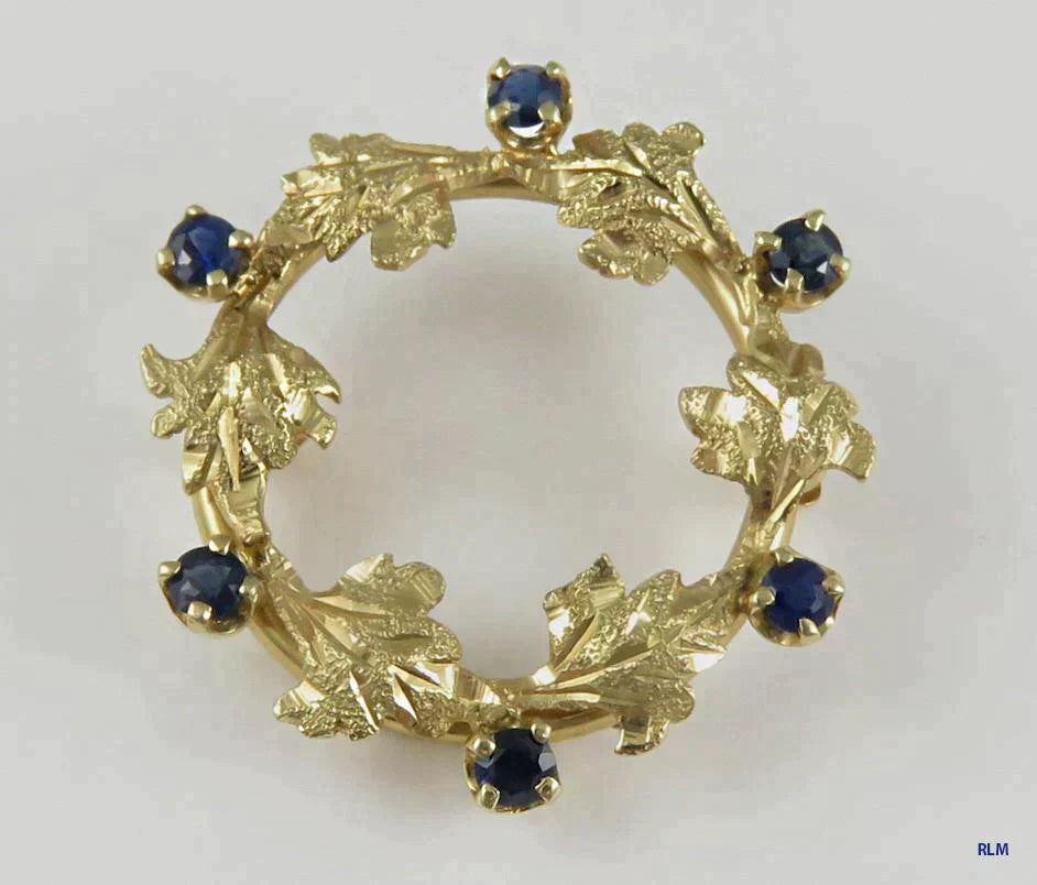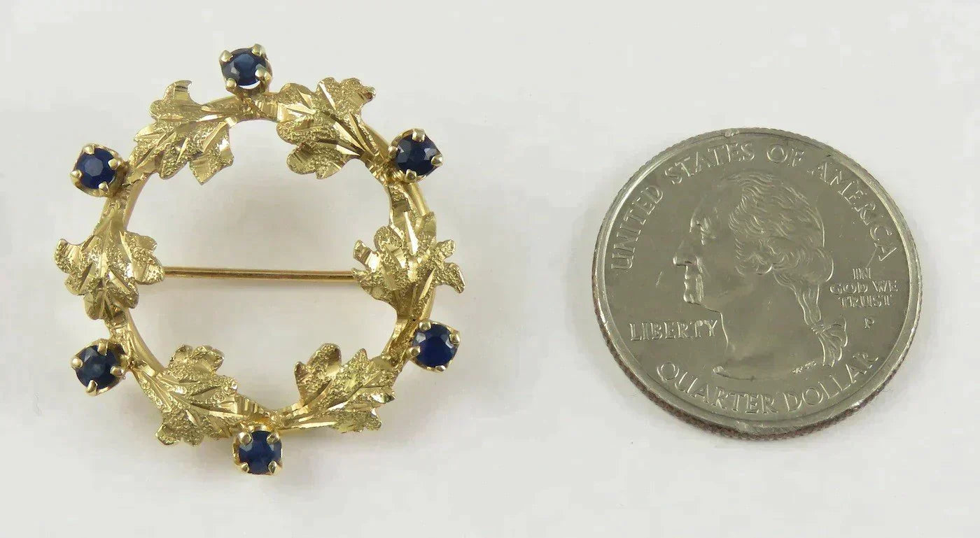 Very Attractive 14K Yellow Gold & Natural Sapphire Leaf Circle Pin