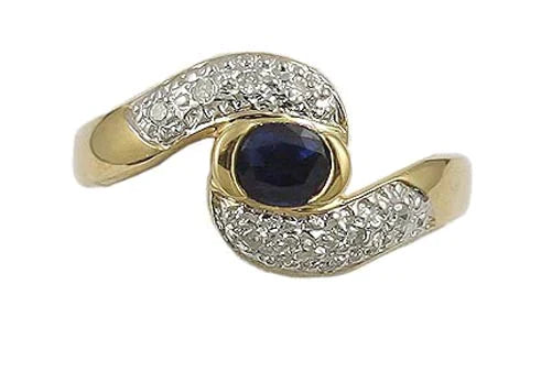 Presented is a pretty 18K gold, sapphire and diamond ring. The ring is topped with a faceted oval sapphire with four small diamonds set above and below in a swirling bypass type setting.