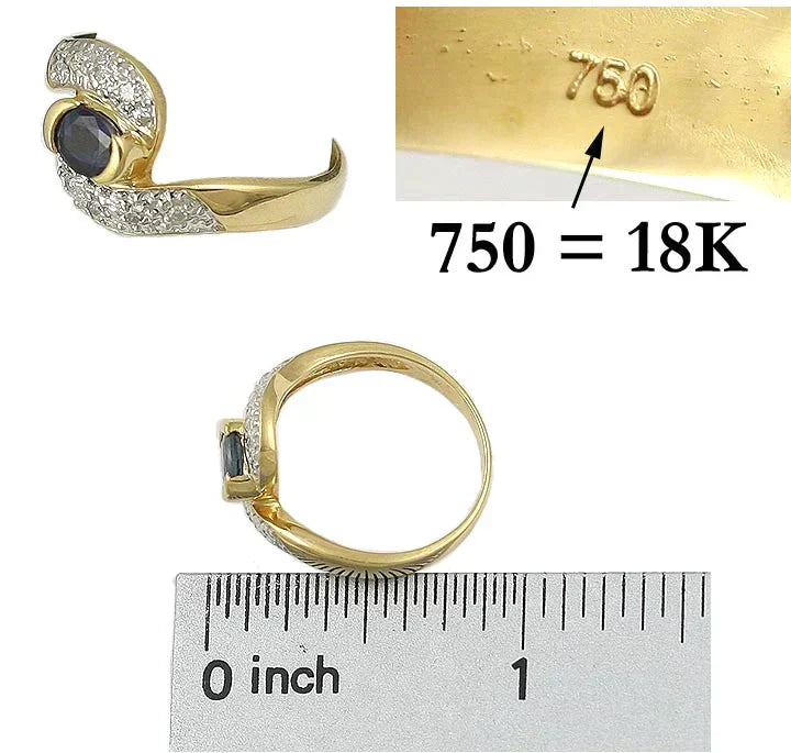This ring is marked 750 on the shank for 18 kt. gold. We have tested it with nitric acid and guarantee it to be 18K gold. The weight is 3.4 grams.This ring is a size 6 1/4, but could easily be made larger or smaller by your jeweler.