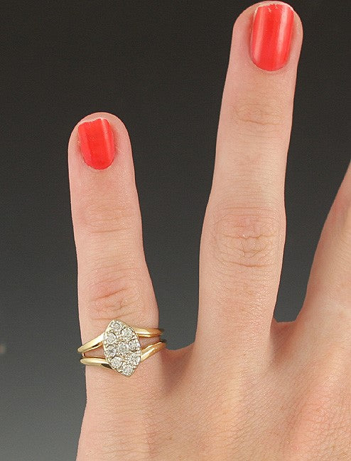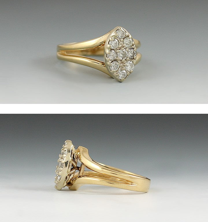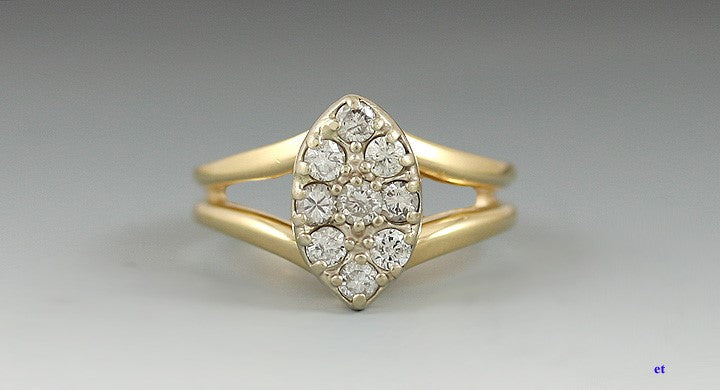 Presented is a very nice 14k gold and diamond ring. The ring has a marquise shaped top set with 9 diamonds. These stones are all modern brilliant round cut stones, with a clarity range of SI-2 - I-1, and I-J color. Each stone is about