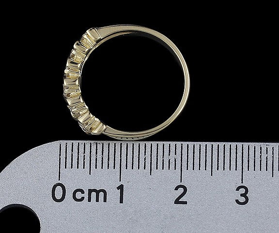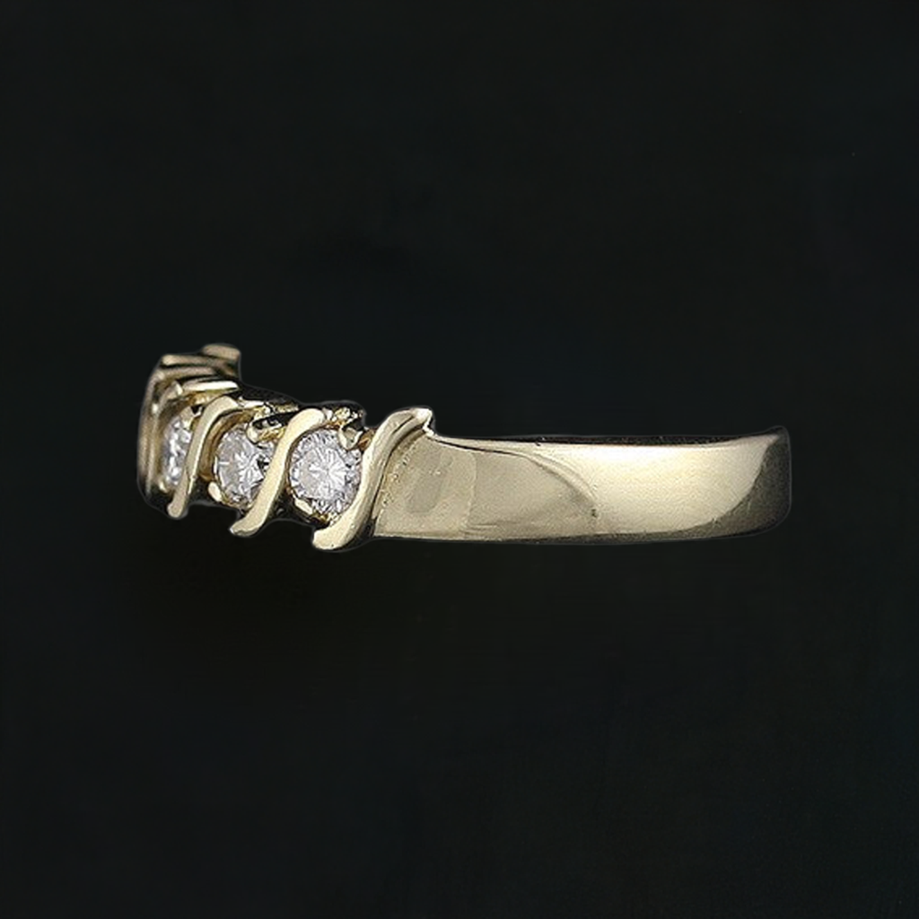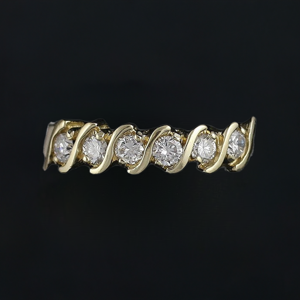 Presented is a stylish 14K yellow gold ring stopped with 6 modern round brilliant cut diamonds. The diamonds measure approximately 2.5 millimeters in diameter each. We estimate the carat weight of each stone to be at least 8 points, probably closer to 10 points. The total carat weight is 1/2 carat or more. The diamonds have I-J color and SI2 to I1 clarity. The diamonds are very well cut and securely mounted in an elegant yellow gold setting. The ring is fairly modern, probably made within the past 30 years.