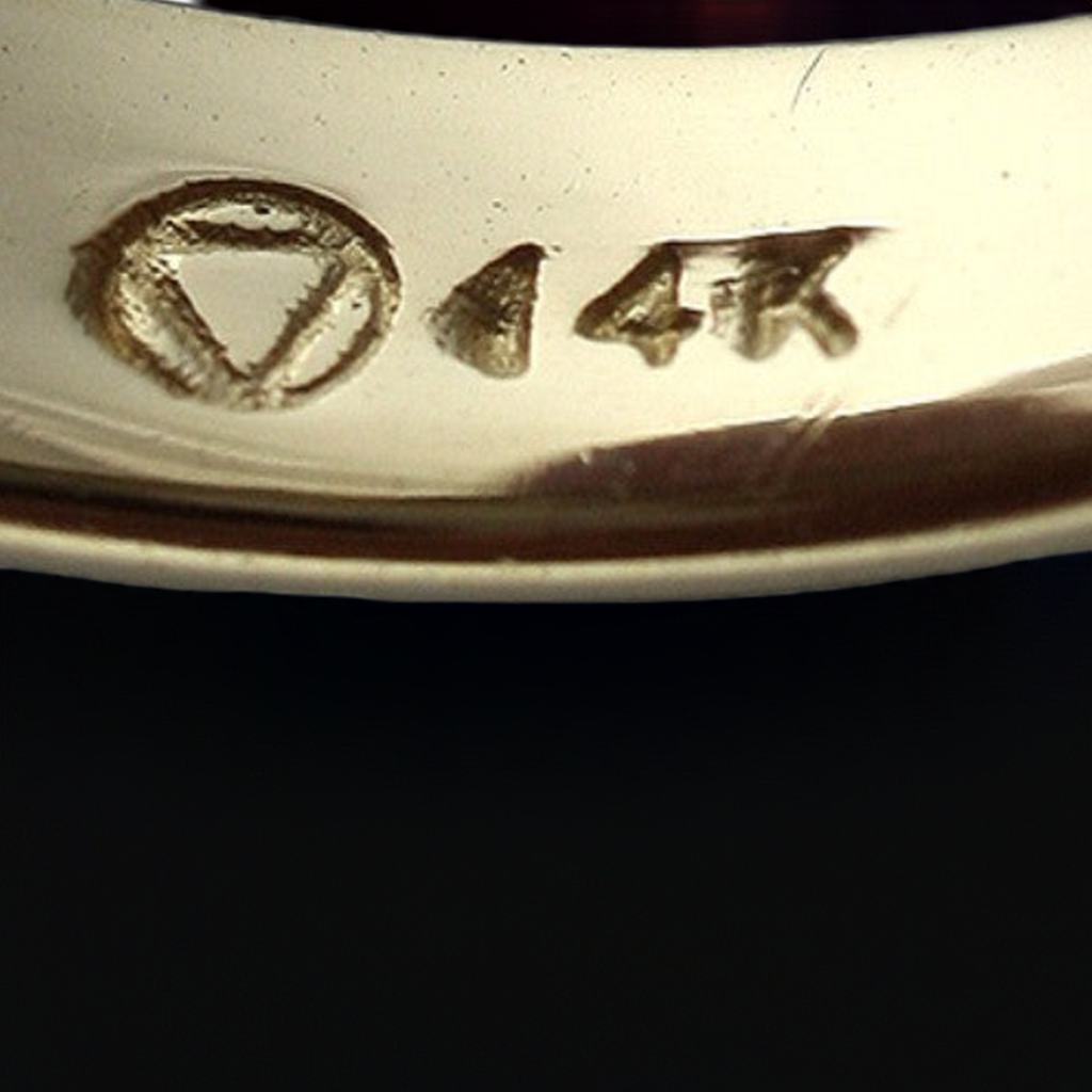 The ring is marked on the inside of the band with 14K and a maker’s mark. We have tested the ring with nitric acid and guarantee it to be 14K gold.