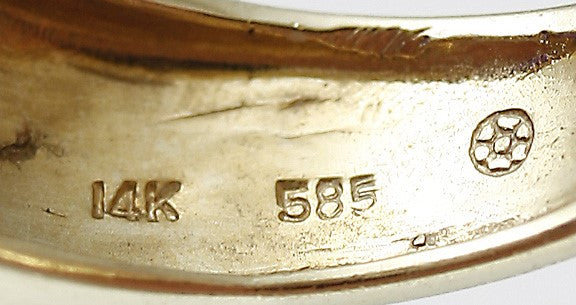 The ring is marked on the inside of the band with 14K, 585 and a maker’s mark. We have tested the ring with nitric acid and guarantee it to be 14K gold.