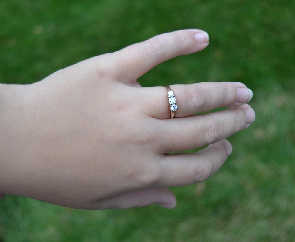 Presented is a wonderful quality, 14 karat two tone gold and diamond wedding or engagement ring. The band is yellow gold and the top has white gold prongs securely holding 3 modern brilliant cut diamonds. The diamonds measure 3.5, 3.9 and 3.5 millimeters in diameter. The stones are well matched, about H color. The center diamond and one of the side diamonds are VS clarity and one side diamond is I clarity. There is at least 1/2 carat in total diamond weight. The ring is a size 6.5 and it can be resized by a professional jeweler.