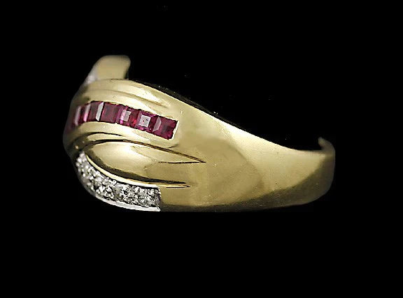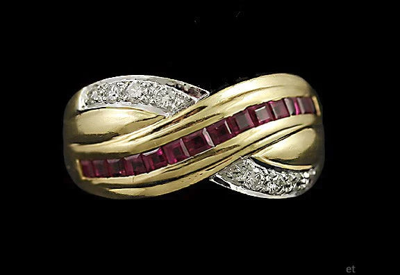 Presented is a quality modern 18K gold, diamond and ruby ring. The ring is topped with 13 square cut rubies and 8 modern round brilliant cut diamonds set in a deep yellow gold mounting. All of the stones, both the diamonds and the rubies are very nice quality. The rubies are quite a bit better in color and much more vibrant than our photos show. The ring is well made and has good weight.