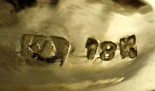 The ring is marked on the inside of the band with 18K and a maker’s mark. We have tested the ring with nitric acid and guarantee it to be 18K gold.