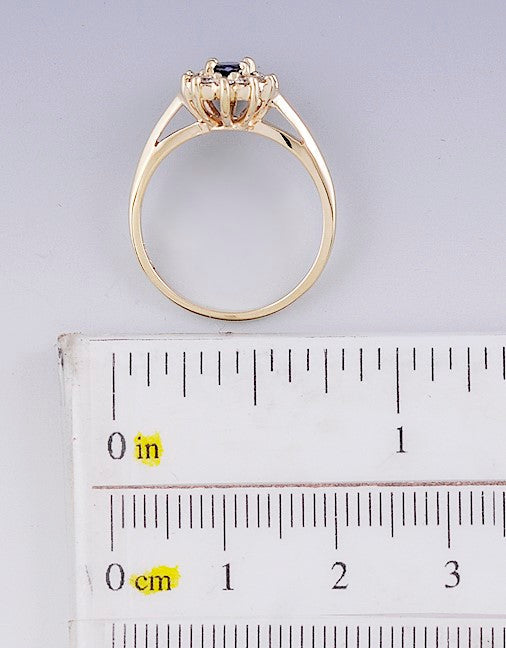 Presented is a fabulous sapphire and diamond cluster ring in 14 karat gold. This is a fairly modern ring, probably of American make. The ring is set with an oval cut sapphire of about 23 points in size, just shy of a quarter of a carat. This is a real, mined-from-the-ground sapphire with gorgeous rich blue color. The sapphire is surrounded with 10 modern brilliant cut diamonds, each about 2 points in size. These are vibrant stones of SI clarity and I/J color, very appealing in combination with the sapphire. The gold setting is sleek and simple, very attractive.
