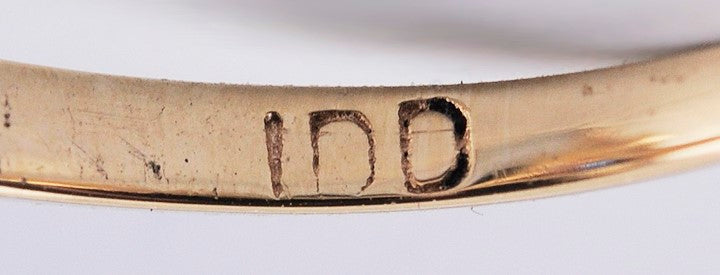The band is stamped and guaranteed 14k and has a maker's mark of IDD.