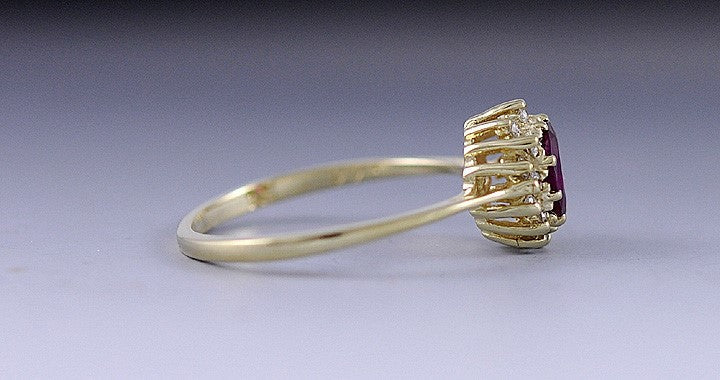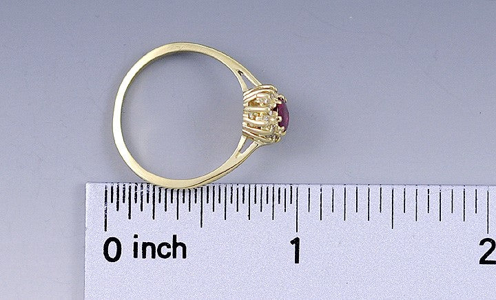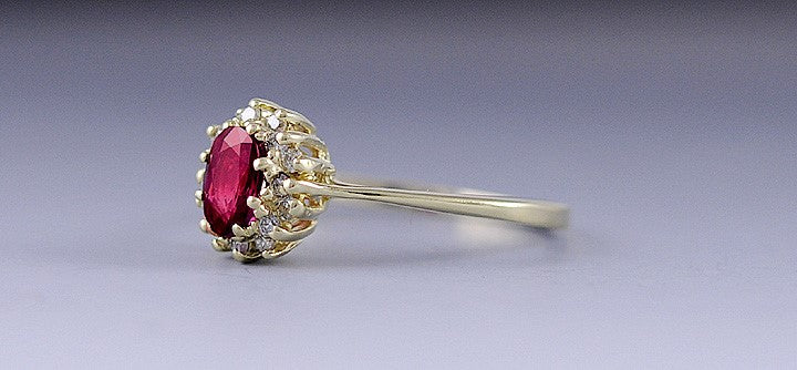 Presented is a lovely diamond and ruby ring in 14 karat gold. This is a modern piece of jewelry, likely of American make. The ring is set with an oval cut ruby of about .65 points in size, a nice vibrant red stone. This is not a lab created ruby, it is a mined-from-the-ground stone. Surrounding this are 16 modern brilliant cut diamonds of about 1 point apiece, of SI clarity. The setting surrounding the diamonds measures 9.1 mm or .357 inches by 7.8 mm or .31 inches. The ruby measures 6.1 mm or .24 inches by 4.1 mm or .16 inches. These are good vibrant stones with a lot of life and sparkle.