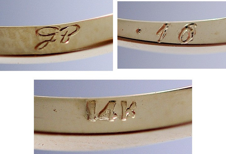 The band is stamped and guaranteed 14k and has a maker's mark of what looks like 'JB' or 'GB'. The band is also stamped .16 for the diamond weight.