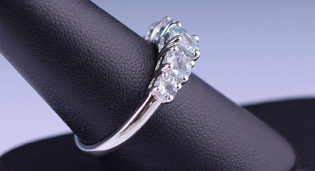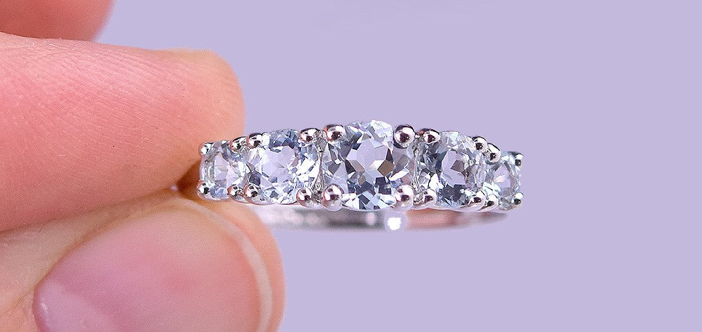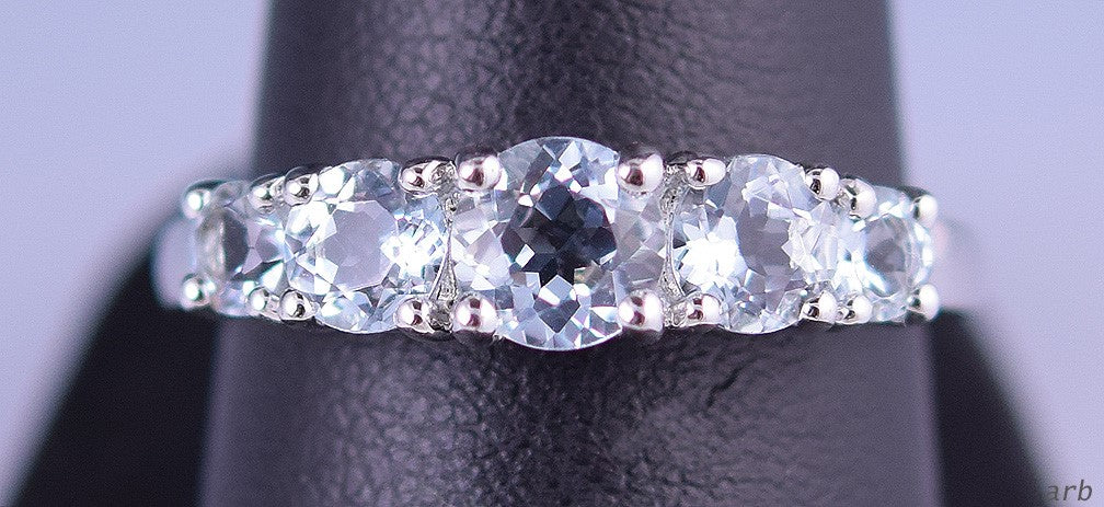 The ring face features 5 clear aquamarine stones. They are graduated in size, with the largest stone in the center.