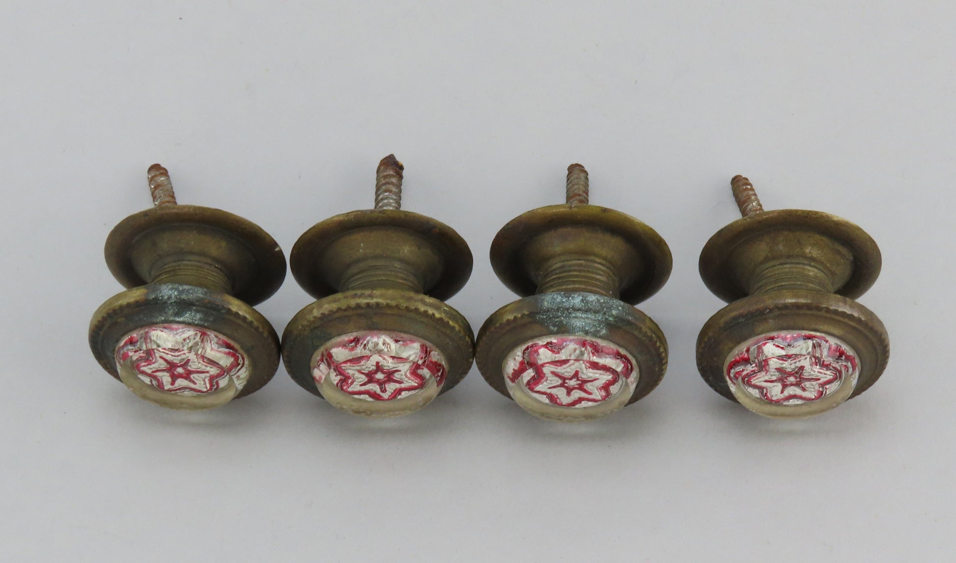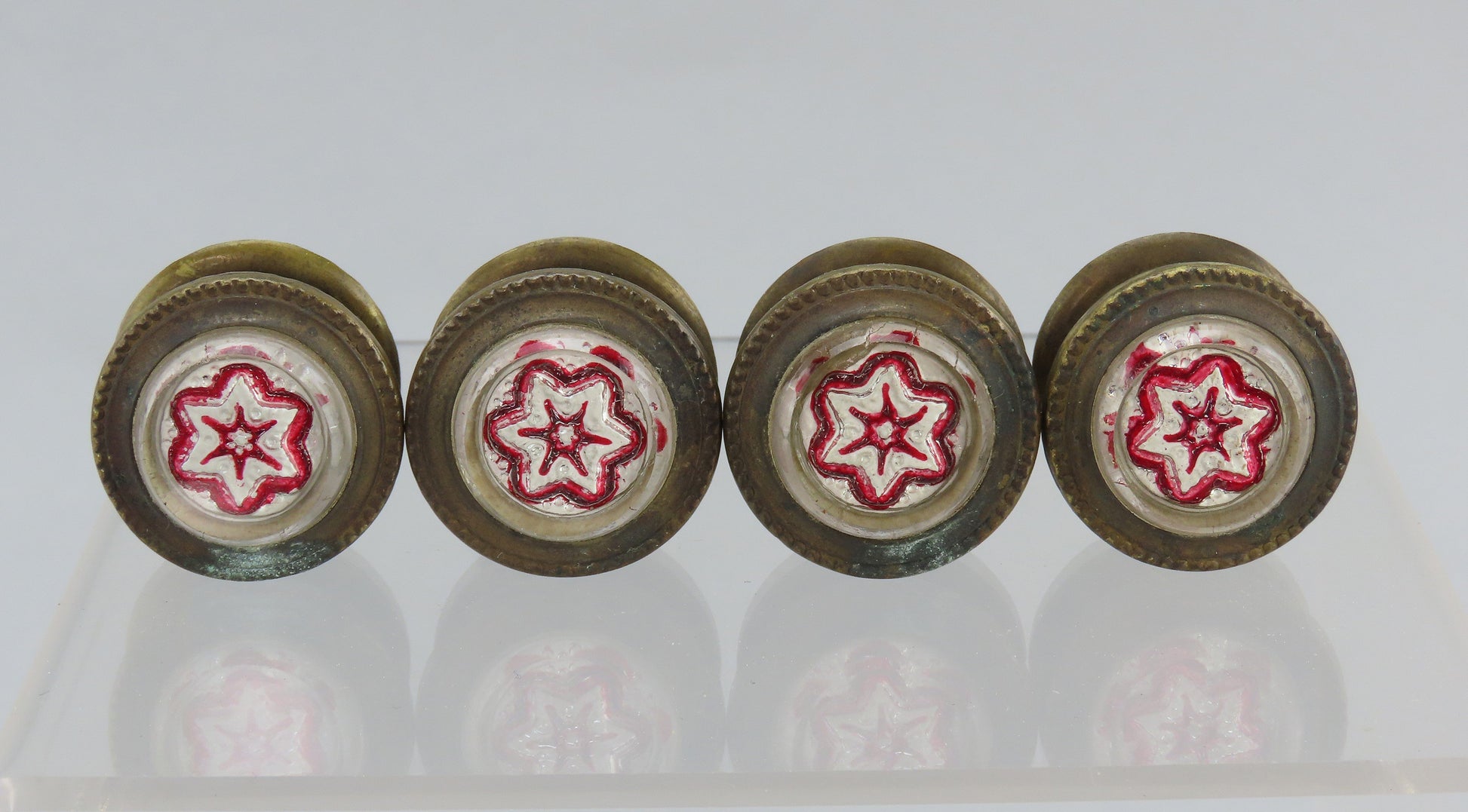 Presented is a set of 4 Victorian sulphide glass and brass curtain tie backs in a small size. The set displays a bronze outer ring with round thick glass within. The glass has a large red and white 6-pointed star at the center. The brass creates a threaded nob shape with a flattened back end. This shape with the screw end could be used as curtain tie backs or as dresser drawer nob handles. Let the photos be your guide. This set is likely American and made between 1830-1870s.