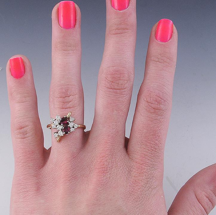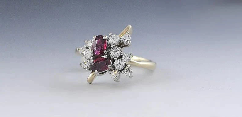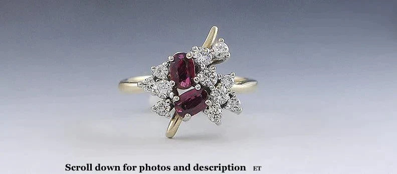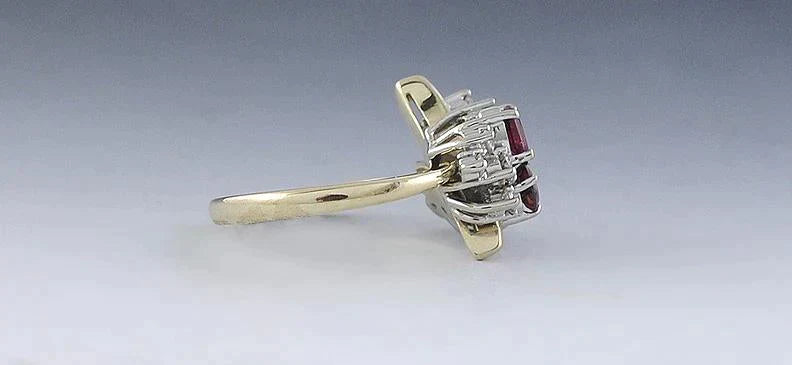 Presented is a fabulous vintage 14 karat yellow gold, diamond and ruby ring. The ring is prong set with two oval cut rubies, about 15 points each in size. The rubies are a gorgeous rich red, beautifully cut to maximize their depth and clarity. Surrounding the rubies are 11 modern brilliant cut diamonds of varying sizes, totaling about half a carat in weight. The diamonds are vibrant dazzling stones of VS clarity and H color. The ring has a stylish asymmetrical design that is very eye-catching.