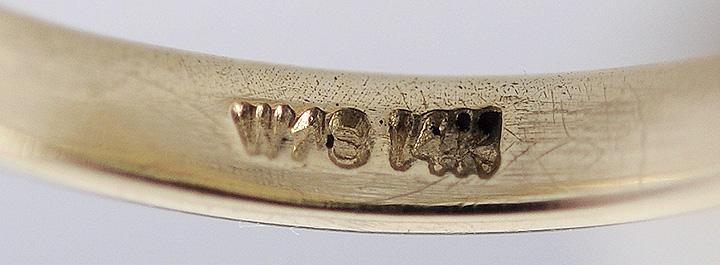 The ring is in great condition. The stones are well set with no chips and only the most minor of surface abrasions. The band has no breaks and no repairs. The ring is stamped and guaranteed 14k, as well as a maker's mark that looks like W&S. The ring is a size 7, but it could easily be resized by your local jeweler. The ring is about 16.5 millimeters at the widest point and about 2 millimeters at the narrowest point. The ring weighs 4.8 grams.-jm