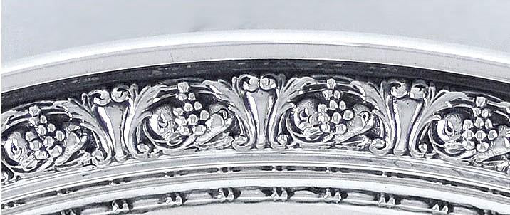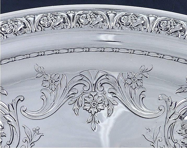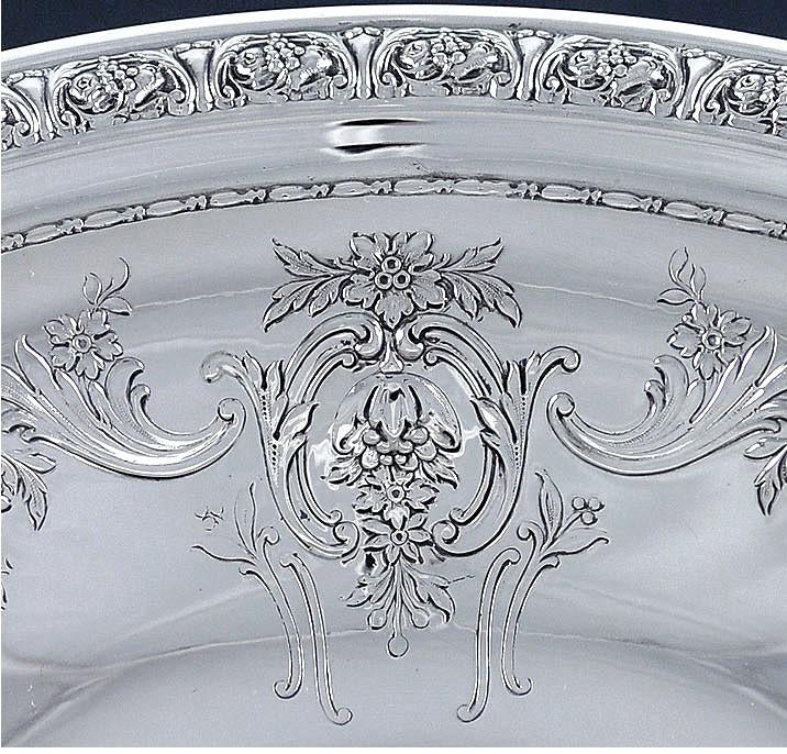 Presented is a terrific, sterling silver serving dish made by the Gorham Manufacturing Company in 1941. This bowl is finely chased and engraved all over. The rim has a highly raised band of grapes and leaves, while the inside of the bowl is engraved with flowing ribbon festoons connecting scroll and flower embellishments.