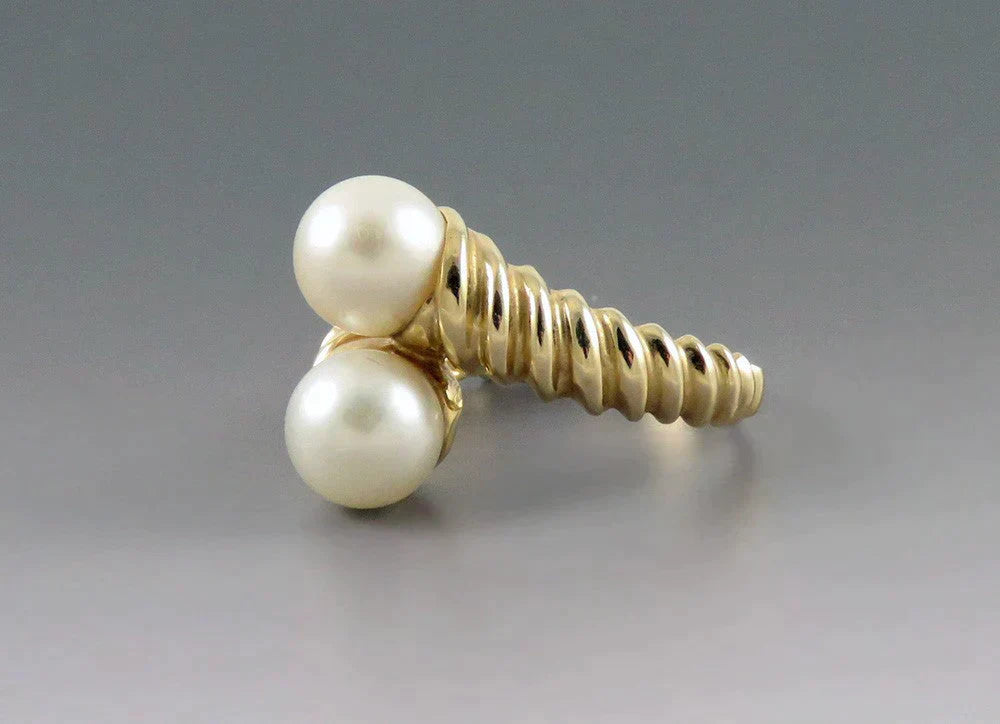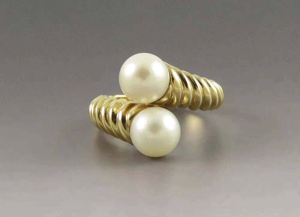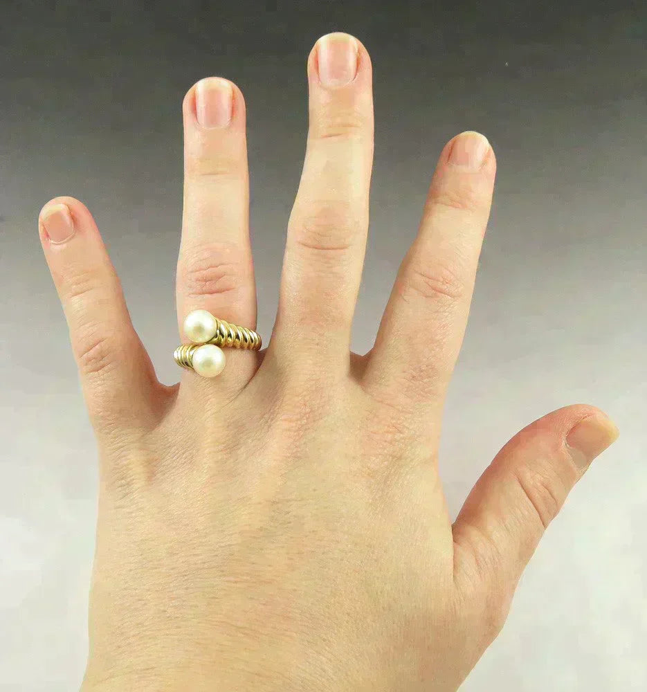 Vintage 1960s 14K Yellow Gold Pearl Double Twin Bypass Toi et Moi Ring