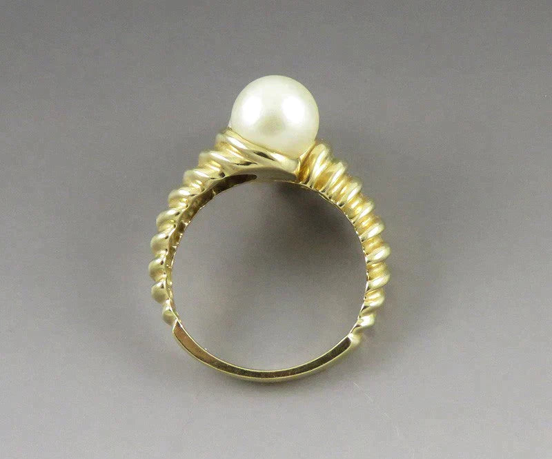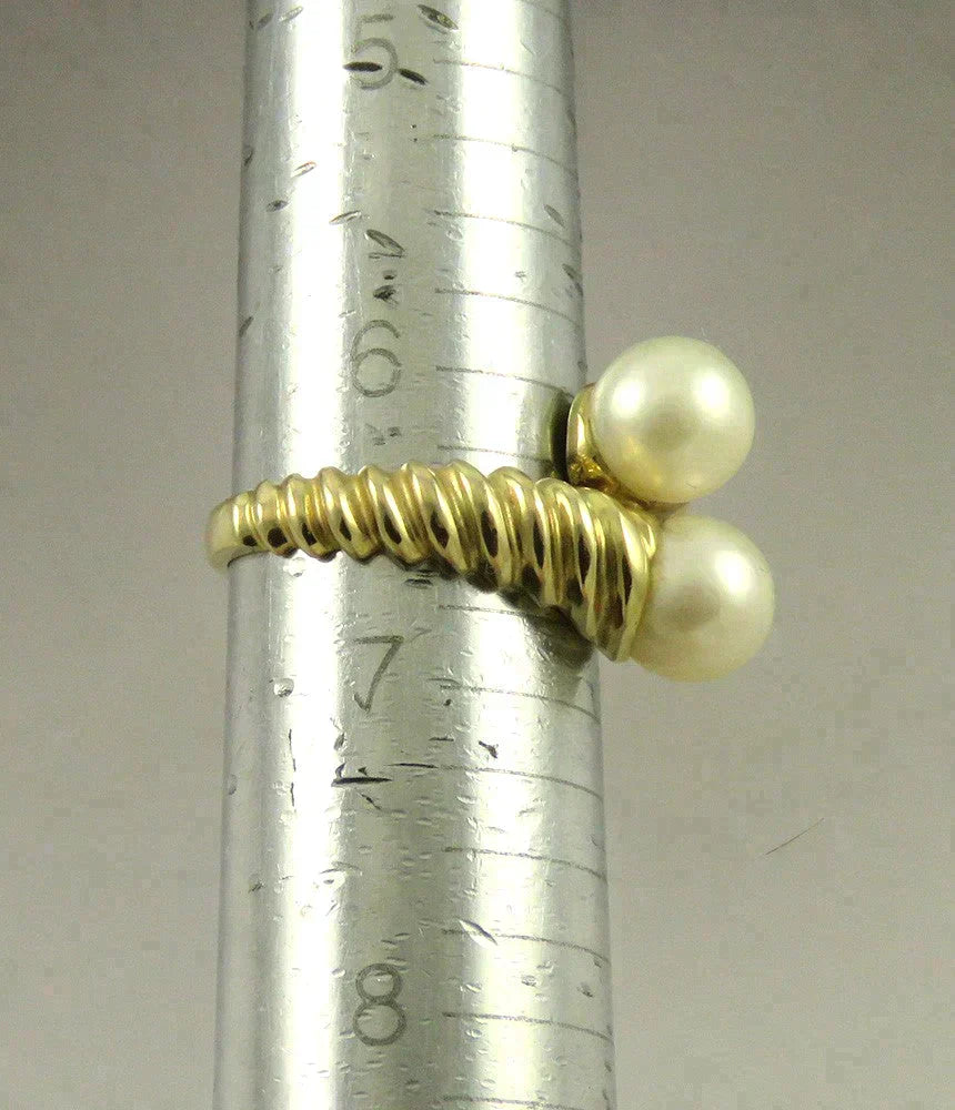 Presented is a vintage, 14 karat yellow gold and pearl twin bypass ring made in America around the 1960s or the 1970s. This pretty ring is done in a bypass form and the band has a neat, ridged sort of design. The top of each end is securely set with a lustrous pearl. Each pearl measures 7.5 millimeters in diameter. This ring is a size 6 1/2 and it can be resized by a professional jeweler.