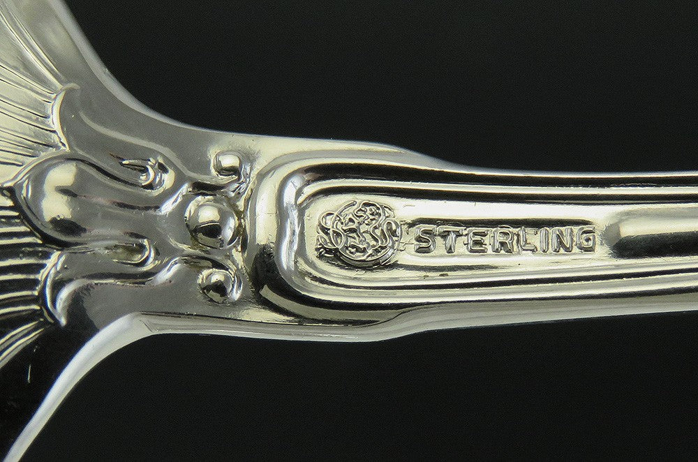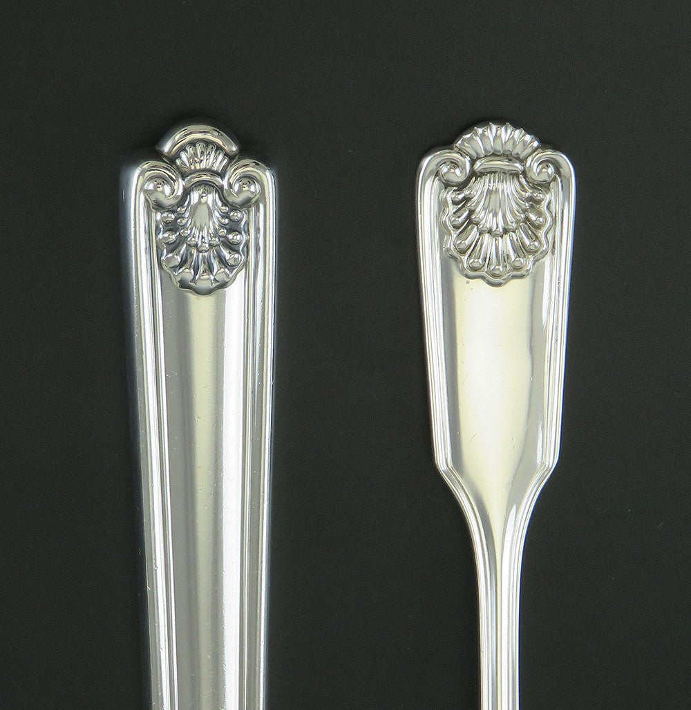 This set is in excellent overall condition. There is minor surface wear to the pieces but the raised designs are crisp. One knife handle has a slight dent to the very tip.