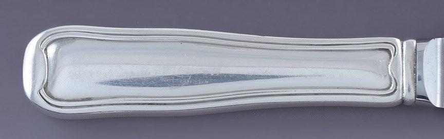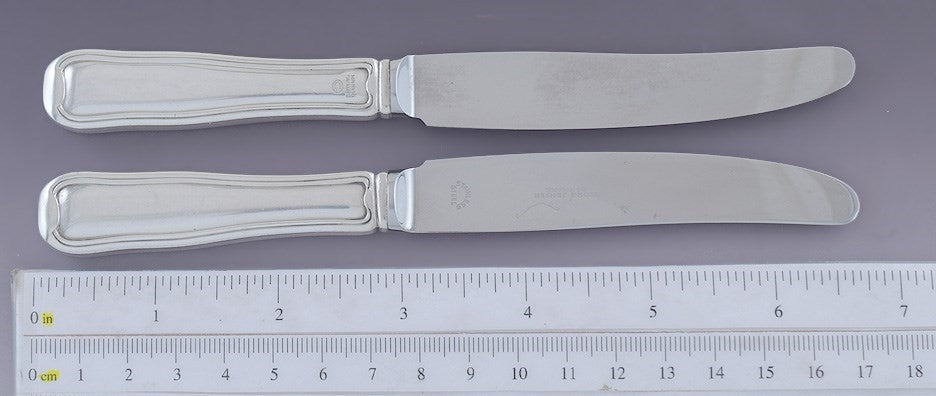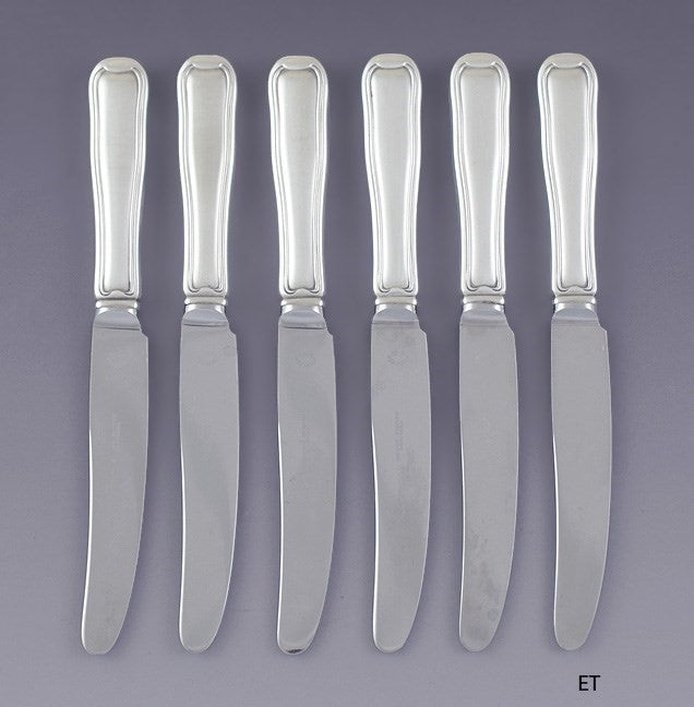 Presented is a great set of 6 Georg Jensen sterling silver knives. These knives are made in the lovely Old Danish pattern, which began production in 1947. This is a handsome classical pattern, similar to the popular Fiddle Thread type patterns. The knives have sterling silver handles and stainless steel blades in the New French form. These pieces are well made from thick, heavy gauge sterling silver, with a nice feeling of weight and balance in the hand.