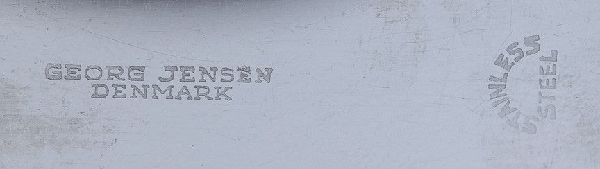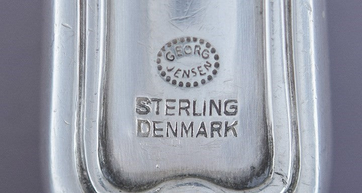 Each knife is stamped with the Georg Jensen maker's mark as well as sterling and Denmark on the handle, with Georg Jensen, Denmark, and stainless steel on the blades.