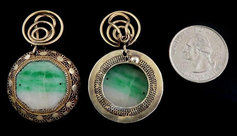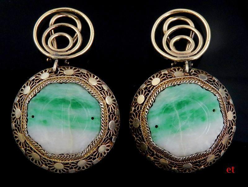 Superb Chinese Carved Jade Silver & 14K Gold Dangle Clip Earrings