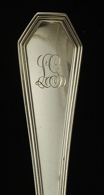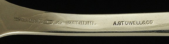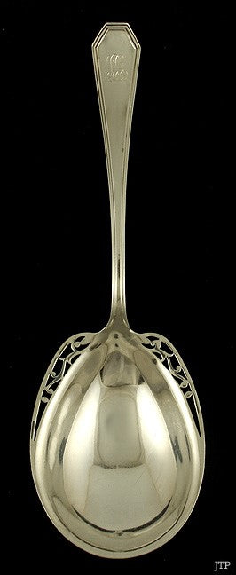 The serving spoon is marked on the reverse with Sterling, the maker’s mark for Dominick & Haff, Pat’d.‘10, and A. Stowell & Co. for the retailer.