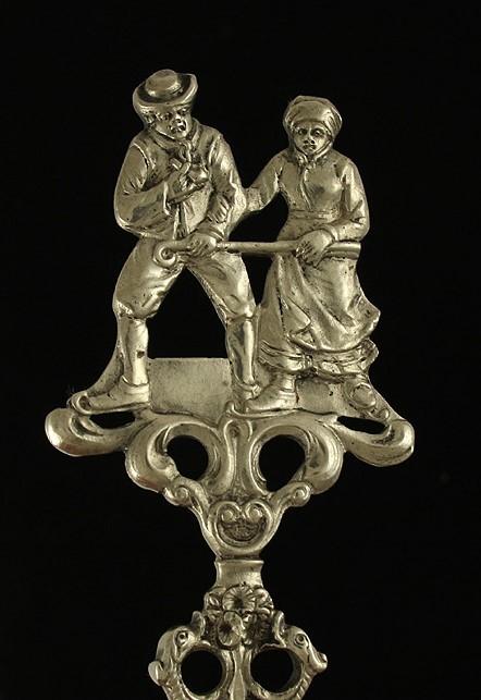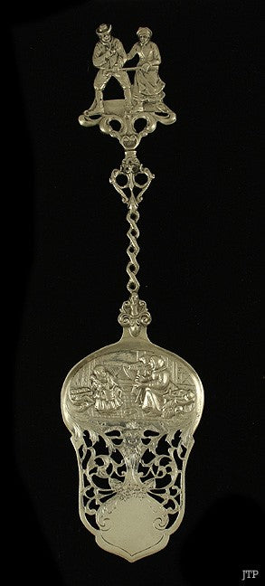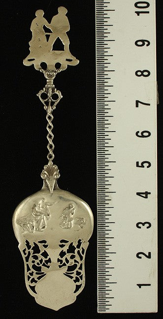 Presented is a decorative German silver server made around the turn of the 20th century. This piece is very much in a classical Dutch silver motif. The openwork base of the server has a raised genre scene at the top. The twisted rope handle has a large man and woman design at the tip.