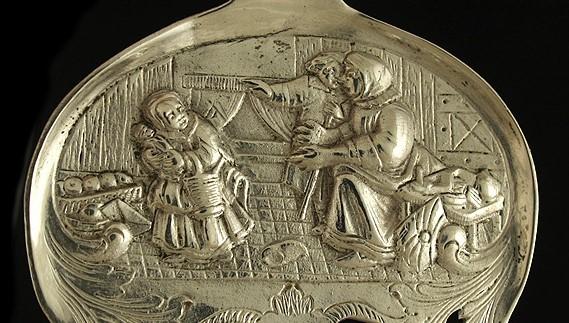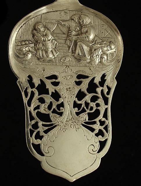 Vintage German Silver Dutch Style Openwork Genre Scene Serving Spoon 10"