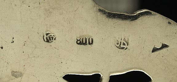 The back is marked 800 for the silver purity and has the German crescent moon and crown symbols.
