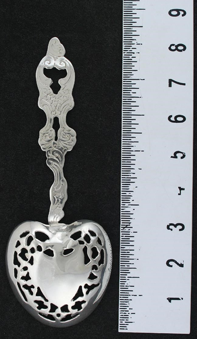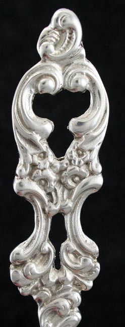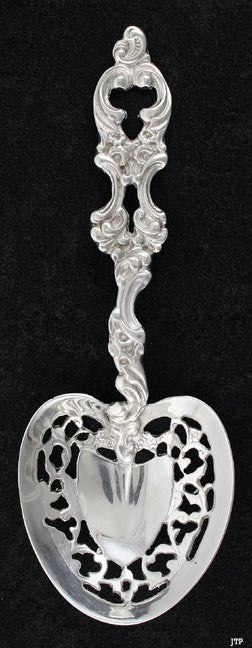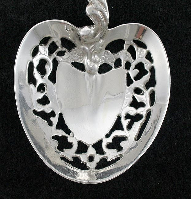 Presented is a fine sterling silver spoon, probably by the Boston silversmiths, Silvercraft. The spoon has a pierced, heart shaped bowl and an openwork handle decorated with elaborate flowers, scrolls, and leaves. This spoon was probably made in the 1950s or 1960s.