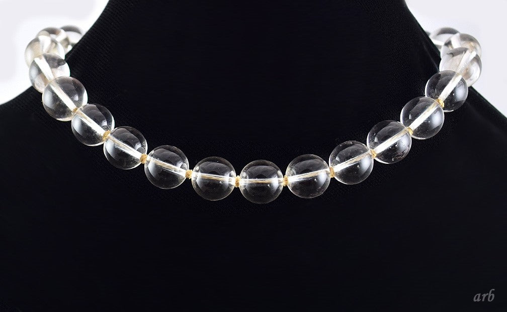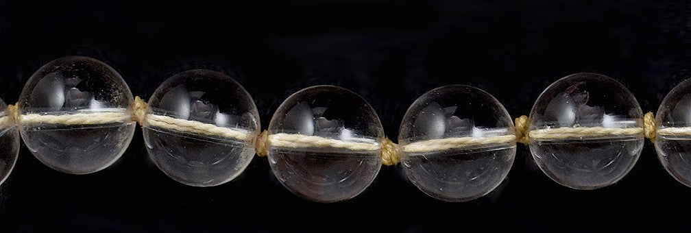 This piece features polished, round, 12.18mm orbs of clear rock crystal (quartz).