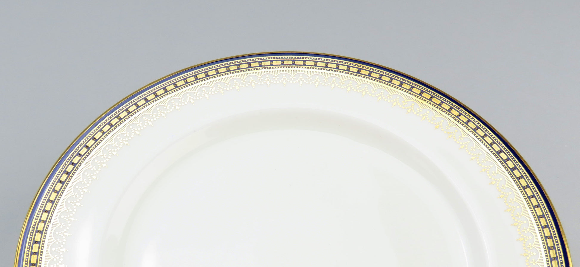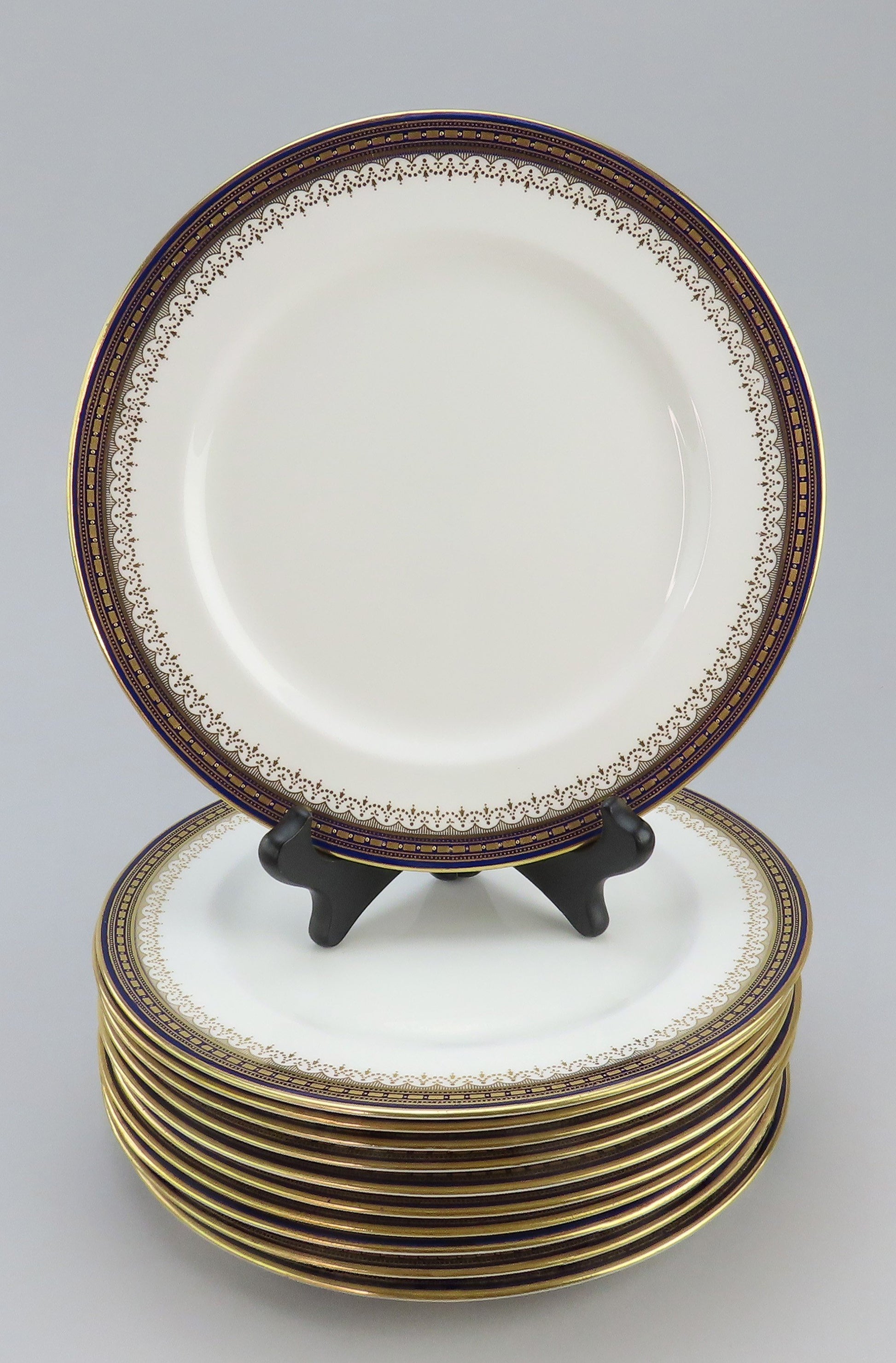 Presented is a set of 11 porcelain luncheon plates from Royal Doulton. This pattern displays a beautiful cobalt blue boarder with delicate gold decorations. The set was likely made circa 1910 to the 1930s.