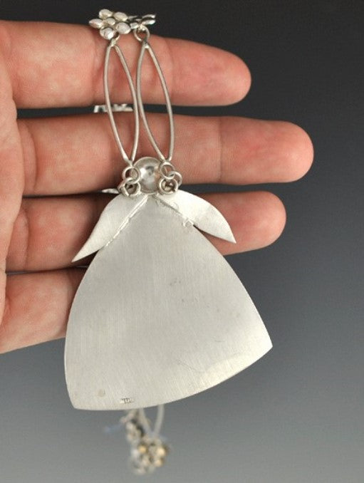 Presented is a vintage sterling silver necklace with large pendant. This necklace and pendant showcase a floral motif in the Arts and Crafts style dating to the 1950s. This piece was handmade in the USA. Both pendant and chain are stamped "sterling."
