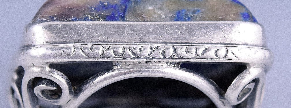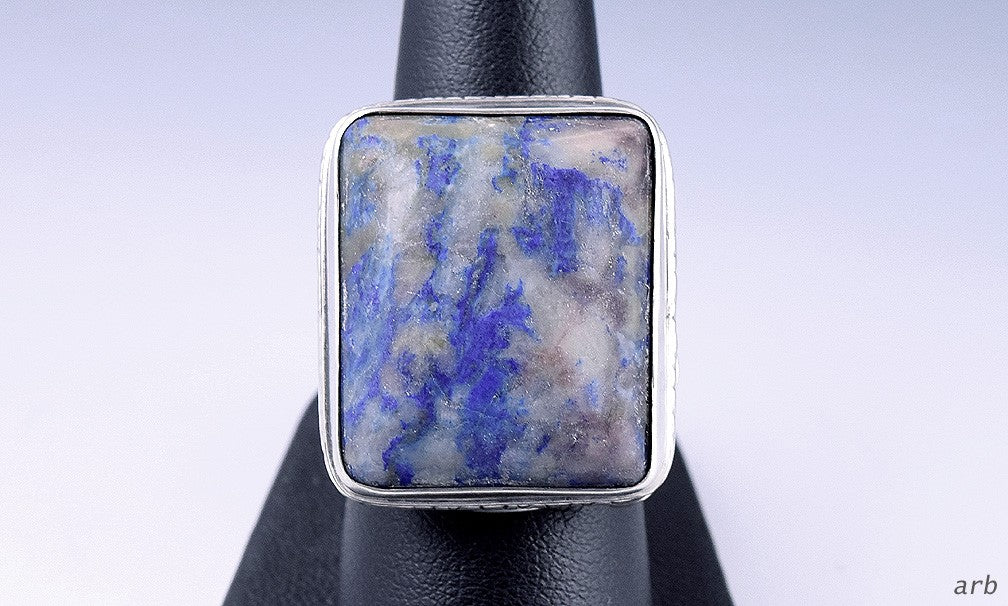 The ring features a large square-cut blue stone, most likely sodalite, set within sterling silver. The sides of the band have neat, swirling designs.