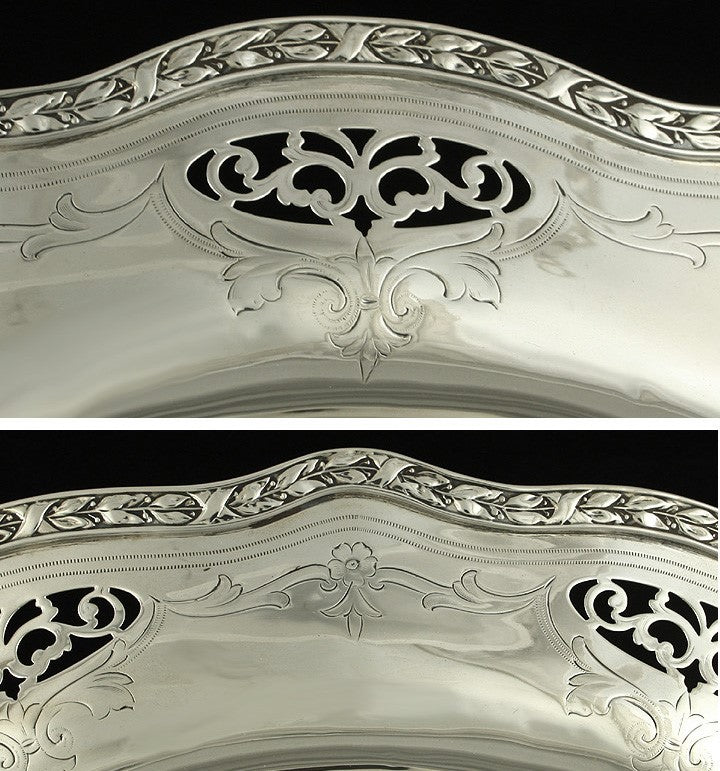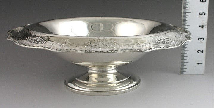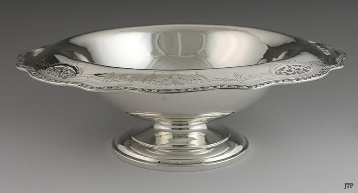 Presented is an attractive sterling silver pedestal bowl made by Wallace. The bowl has elegant openwork scrolls and leaves around the edge accented with flowers and leaves. The bowl has an undulating edge ornamented with a border of die rolled berries, leaves and ribbons. The edge of the bowl is engraved with the old original monogram of ESN in a fancy script.