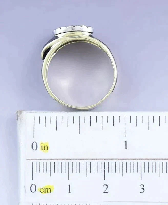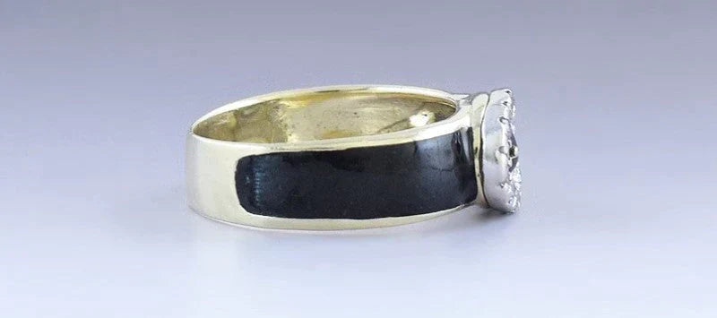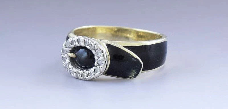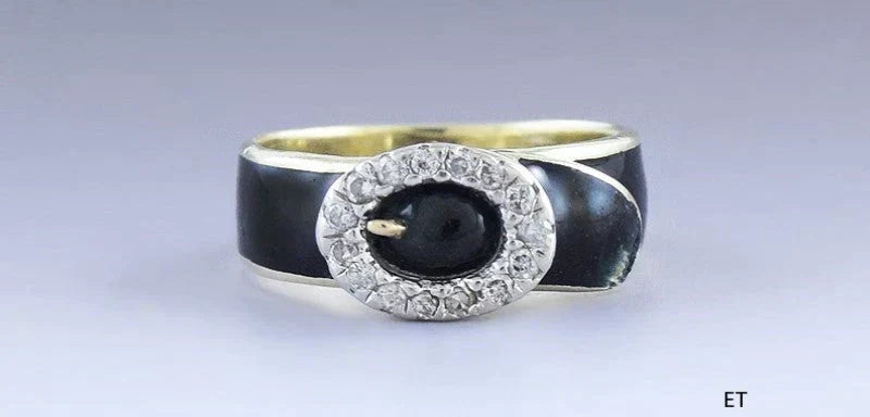 VTG 14k Yellow Gold Diamond Black Enamel Belt Buckle Design Ring