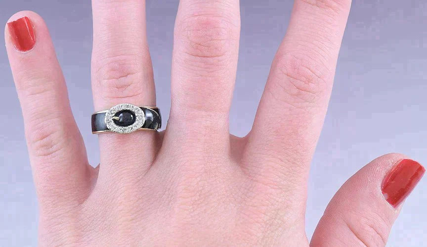 This piece is in great condition overall. There is a little chip to the black enamel on the 'tail' near the buckle and a smaller chip on one side right above where the enamel stops. Only the chip on the tail shows the metal beneath. The diamonds are all intact. The ring is a size 8.5 and measures about 8.6 millimeters north to south at the widest point, and about 5.4 millimeters at the narrowest. This ring weighs 6.6 grams.