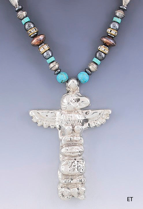 VTG Old Pawn Native American Sterling Silver & Turquoise Totem Pole Necklace