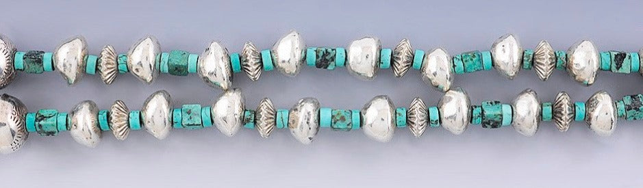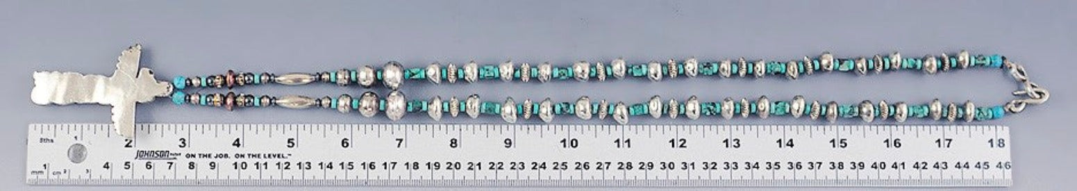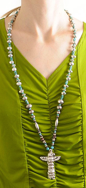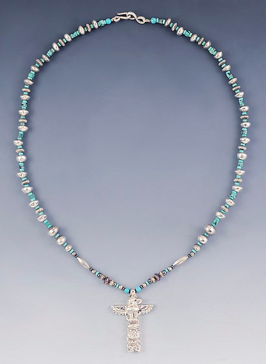 Presented is a wonderful American Indian sterling silver and turquoise totem pole necklace. This piece probably dates to around the 1950s, with some of the beads being a later addition. The necklace is made up of turquoise heche and cube beads interspersed with various heavy silver beads. At the center of the necklace is a heavy sterling silver pendant of a totem pole, topped with an eagle or thunderbird. The clasp is a hook and eye style, with the 'eye' being an infinity symbol. A very weighty and handsome piece of Native American jewelry.