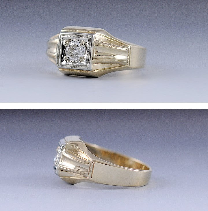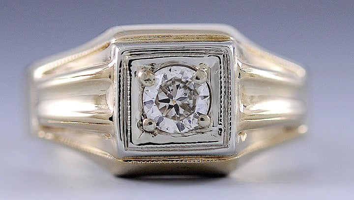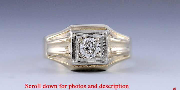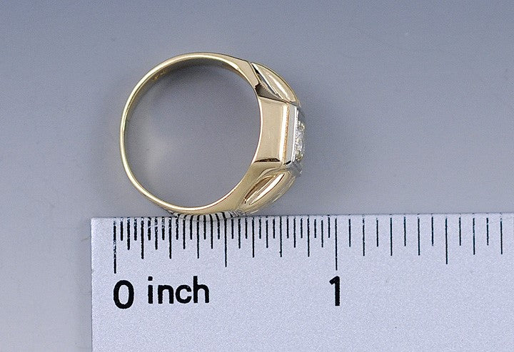 Presented is a handsome, 14 karat 2-tone gold and diamond ring. The mounting or setting is wide. The top is done in white gold and is securely set in the center with a modern brilliant cut stone. The diamond is approximately 25 points or 1/4 carat, is I-1 clarity and J color. The ring is a size 6 .