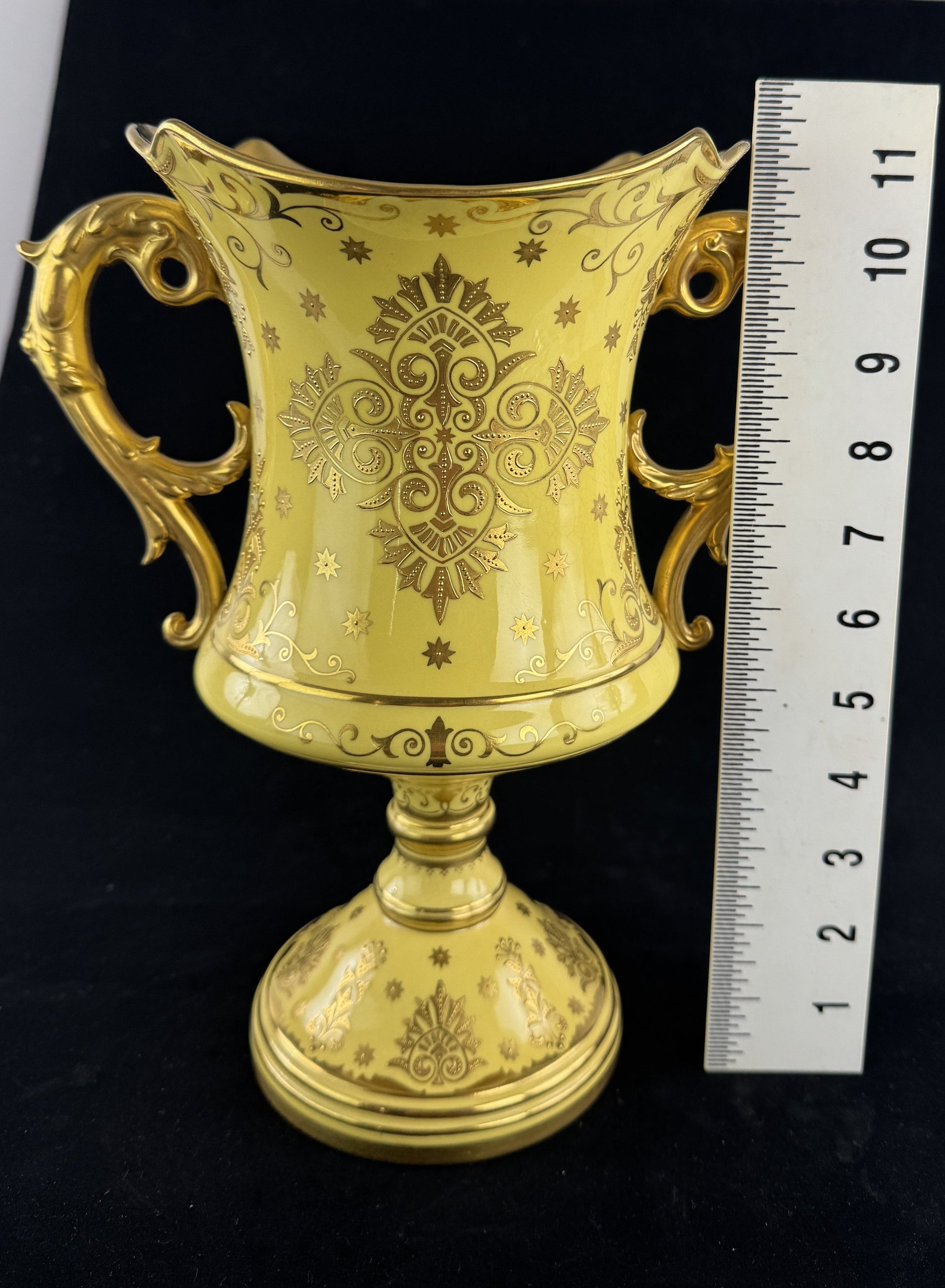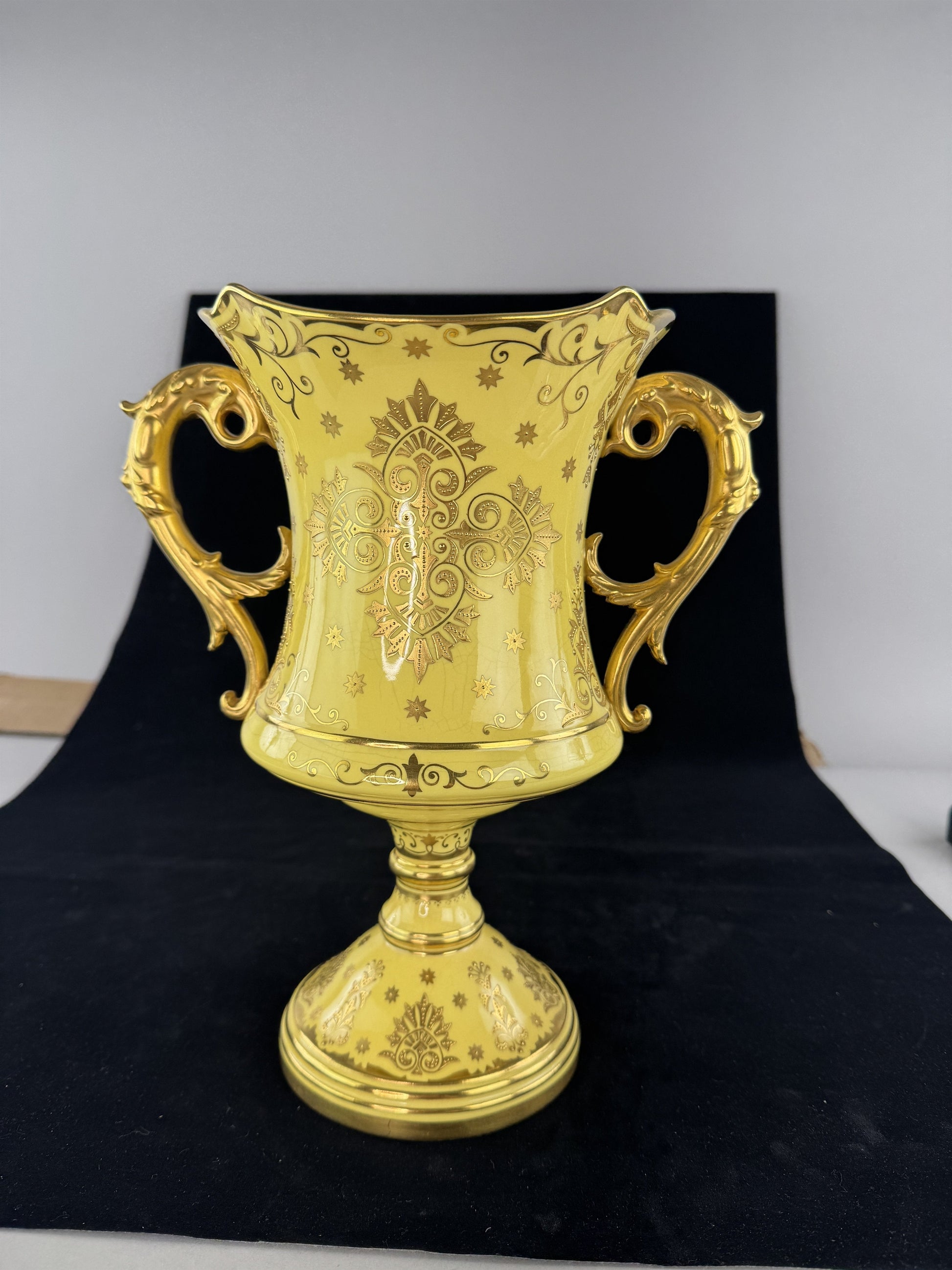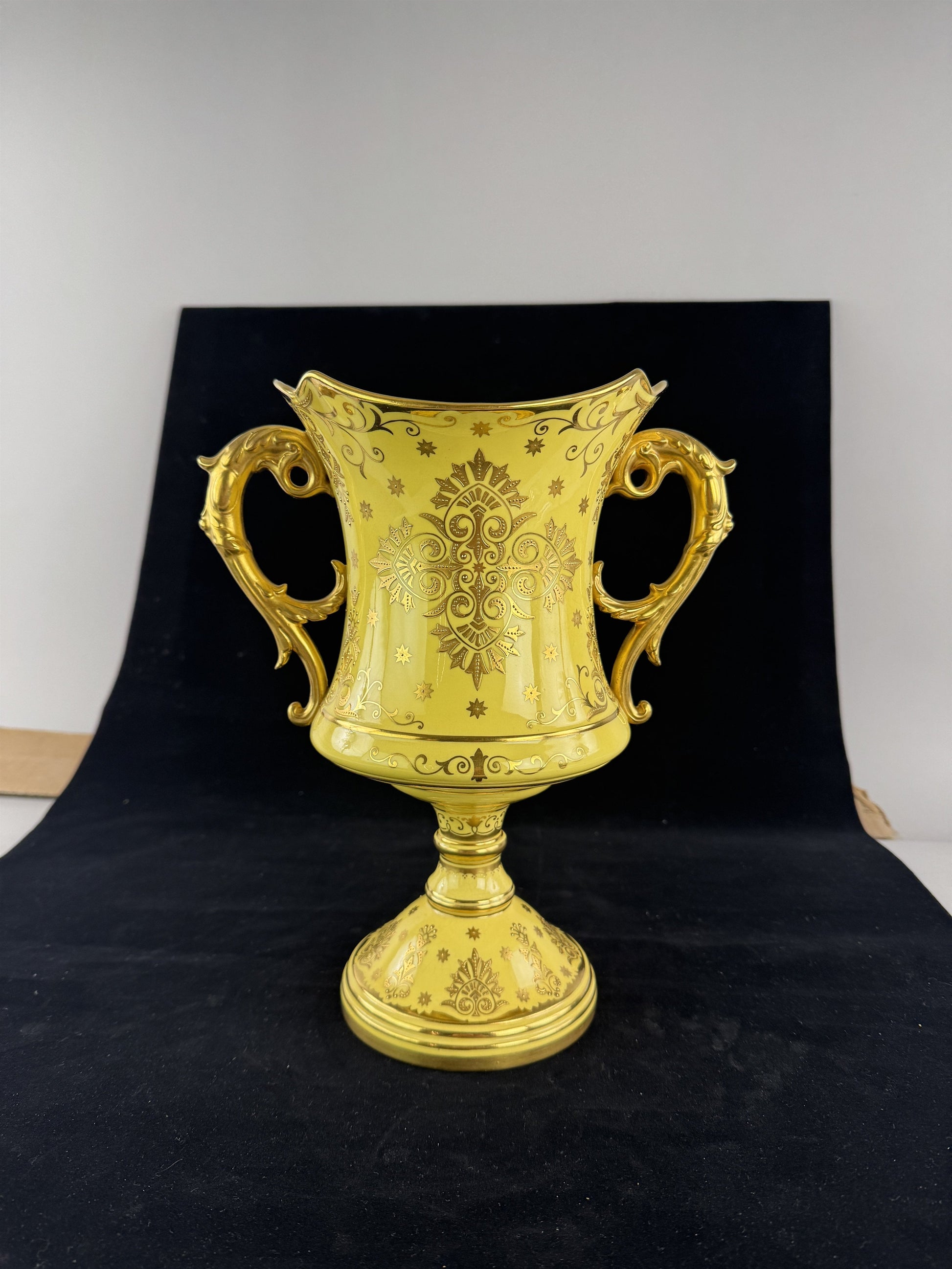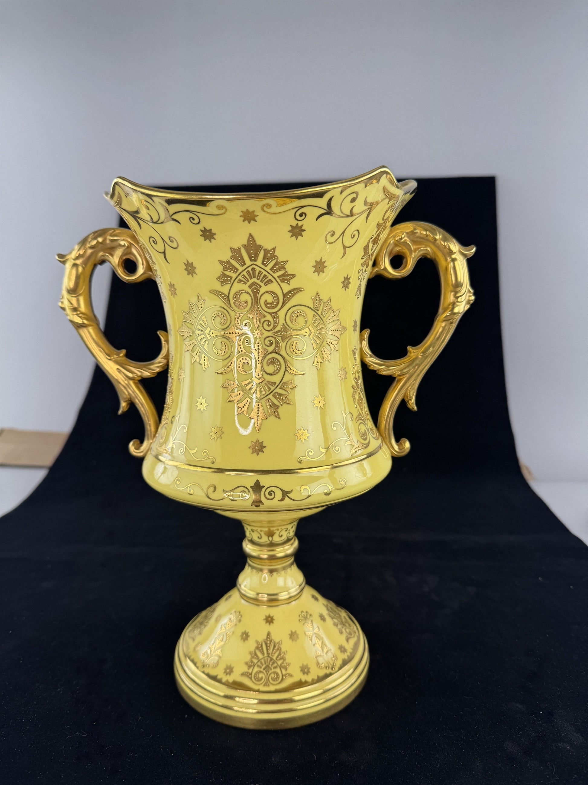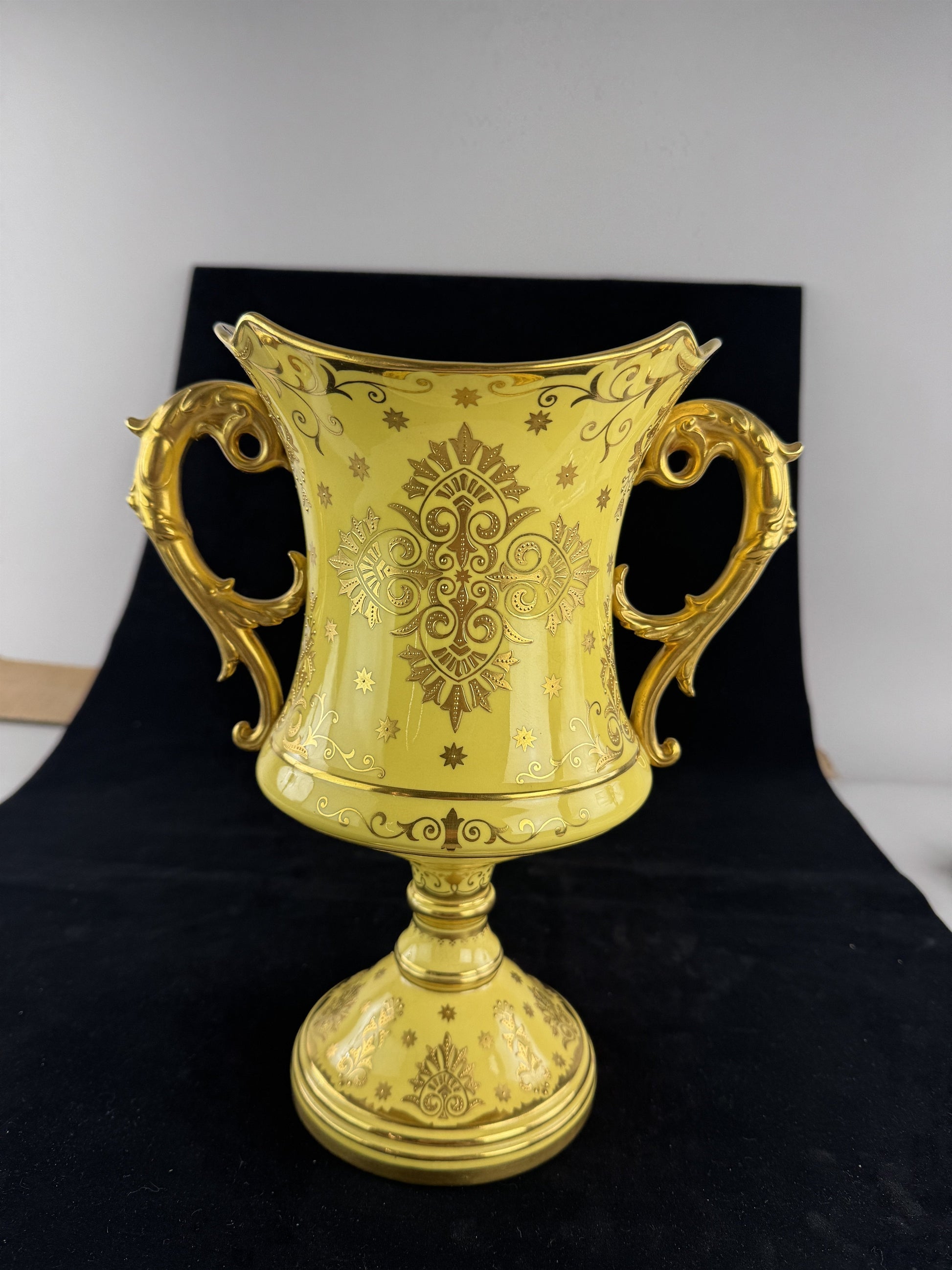 Wonderful c1900 English Coalport Yellow Gold Gilt Double Handle Urn Vase