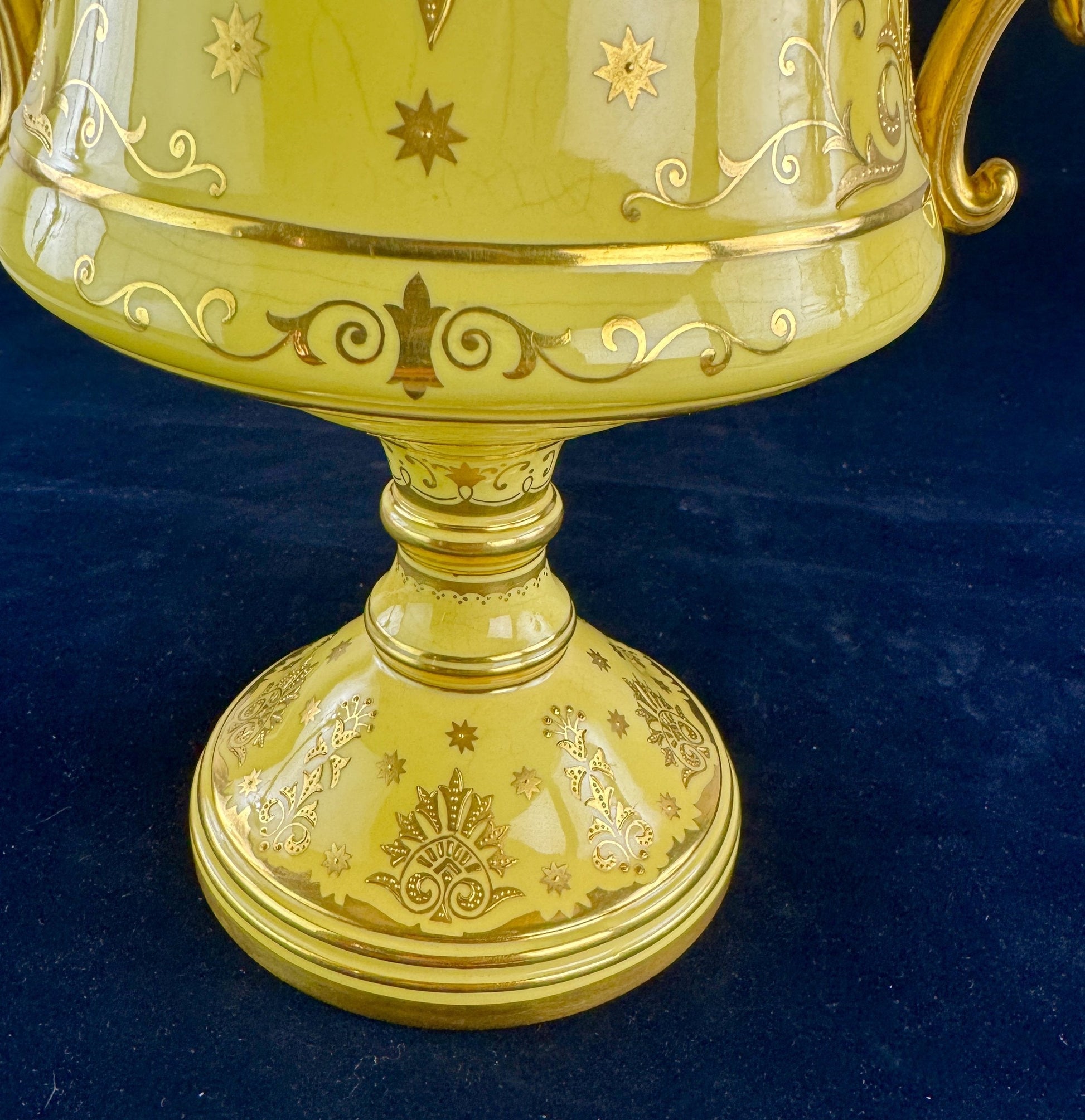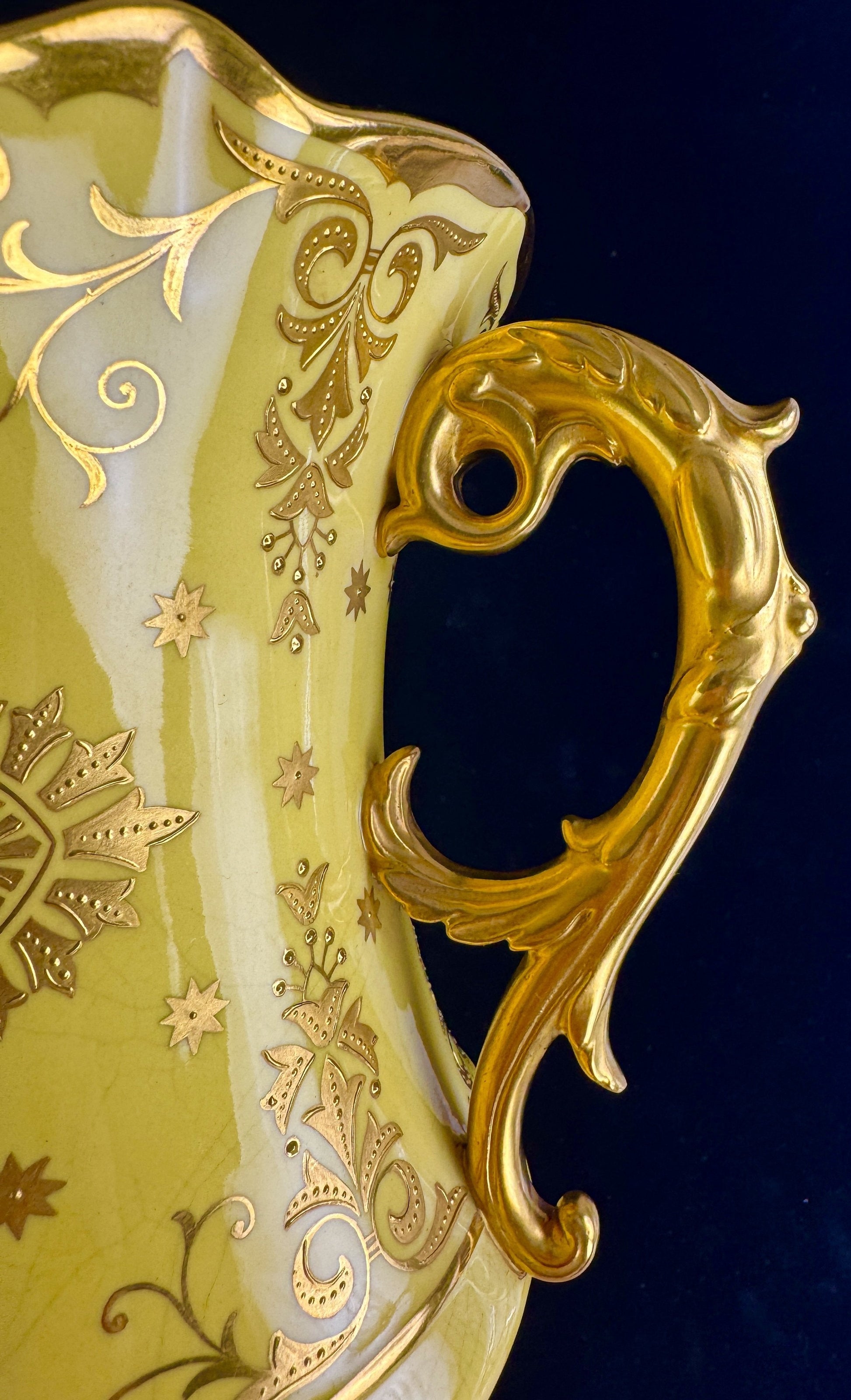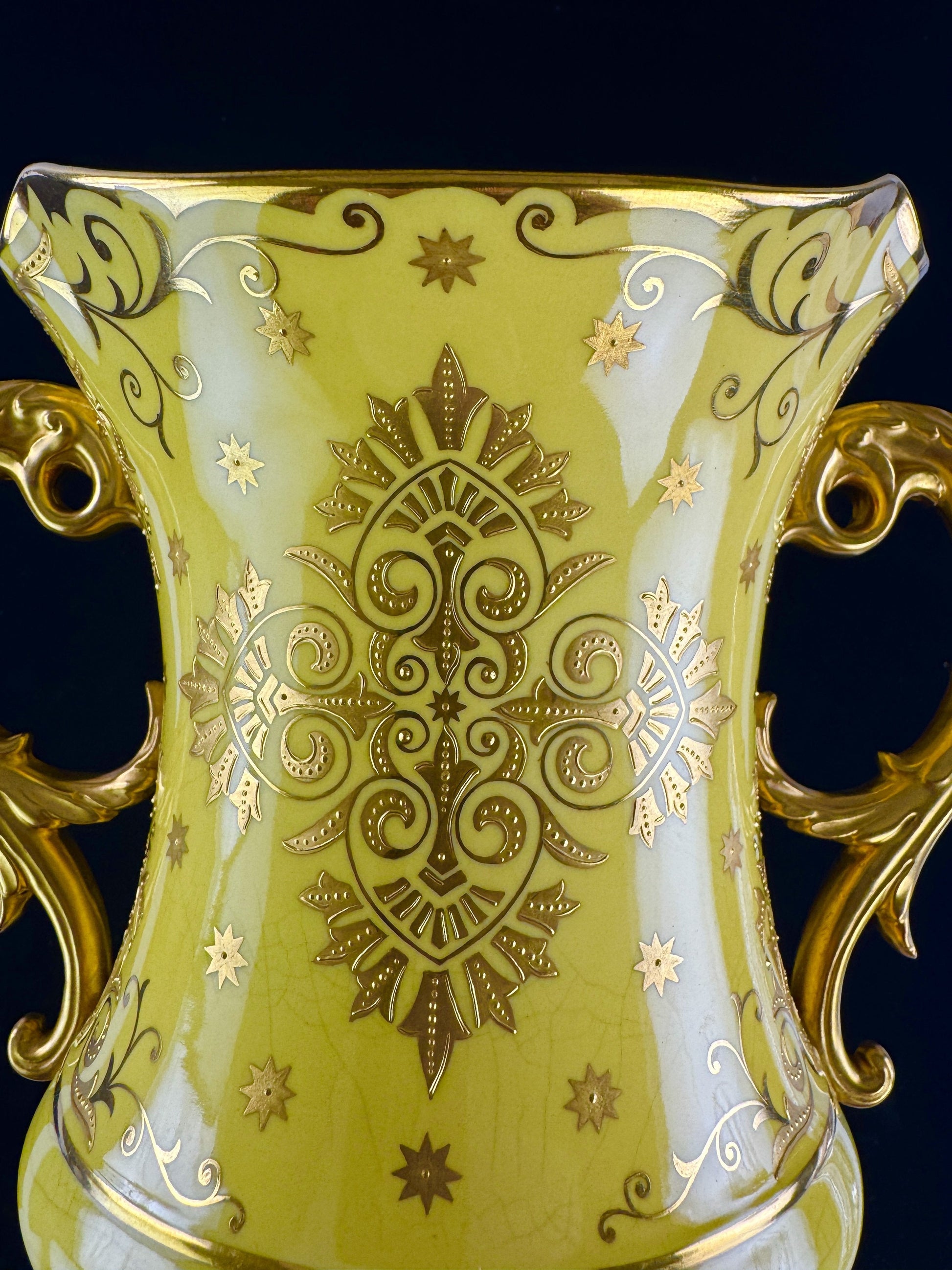 Presented is a fantastic quality Coalport double handled vase or urn dating to 1890-1915.The piece has a vibrant yellow ground color and is very ornately decorated with gold gilt palmettes, stylized flowers and stars, all with raised dots and lines in the gold in the highly textured style for which Coalport is known. The handles and the interior are richly gilt with a matte finish, giving the piece a very regal look.