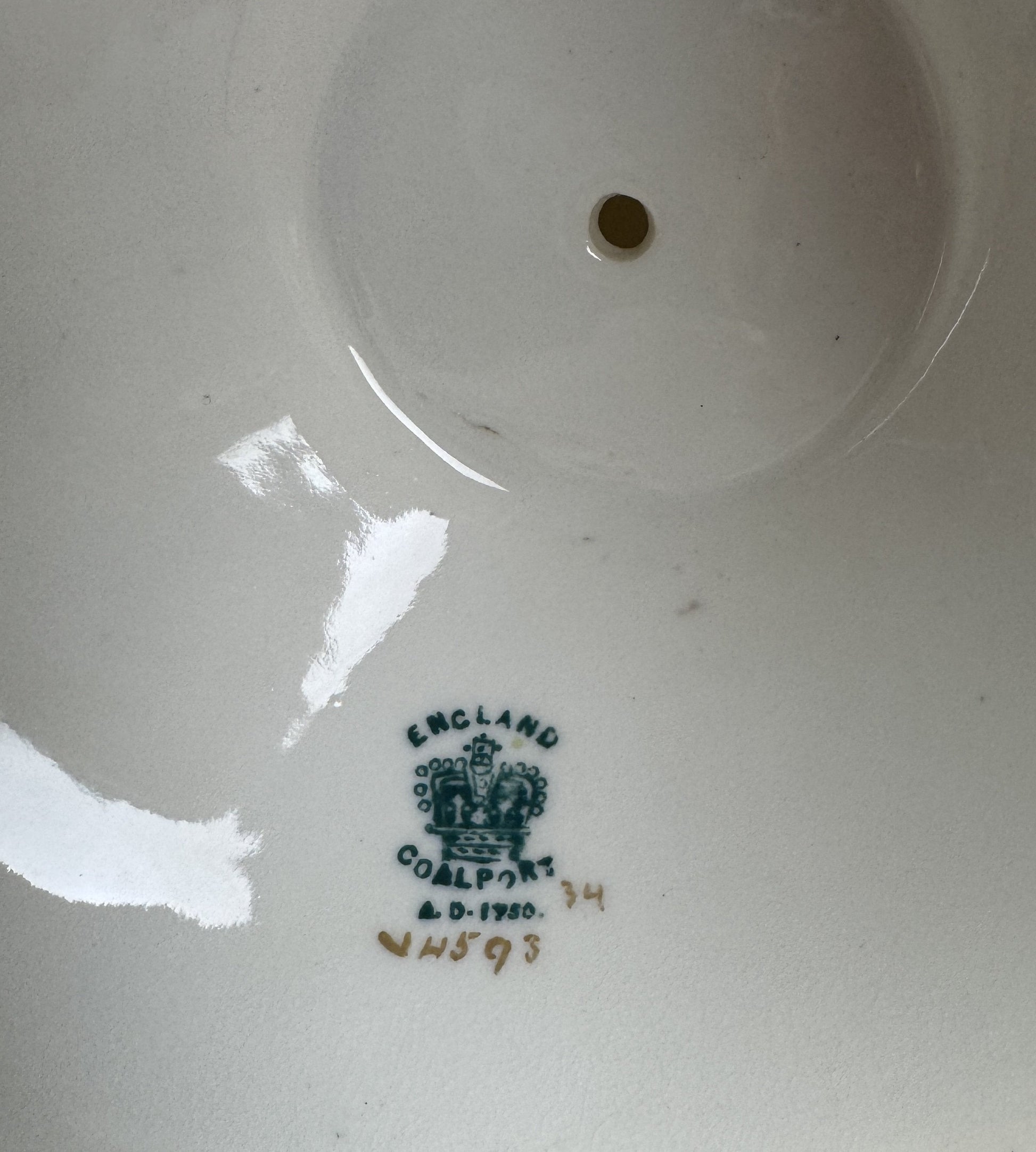 The underside is signed Coalport, England in green, with hand written product or decoration numbers beneath and to the side.
