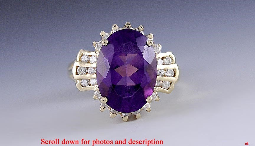 Presented is a wonderful diamond and amethyst 14K gold ring. The amethyst is a very large stone, with great color and very nice clarity. In person, the amethyst's color is a shade darker than in the photos. The pink cast in the